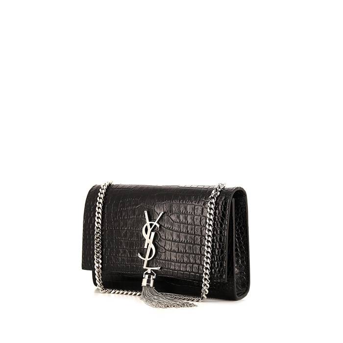 Straordinaria borsa a tracolla Saint Laurent Kate modello piccolo in pelle nera simil coccodrillo, inserti in metallo argentato, una tracolla a catena trasformabile in metallo argentato da portare a mano in spalla o a tracolla.