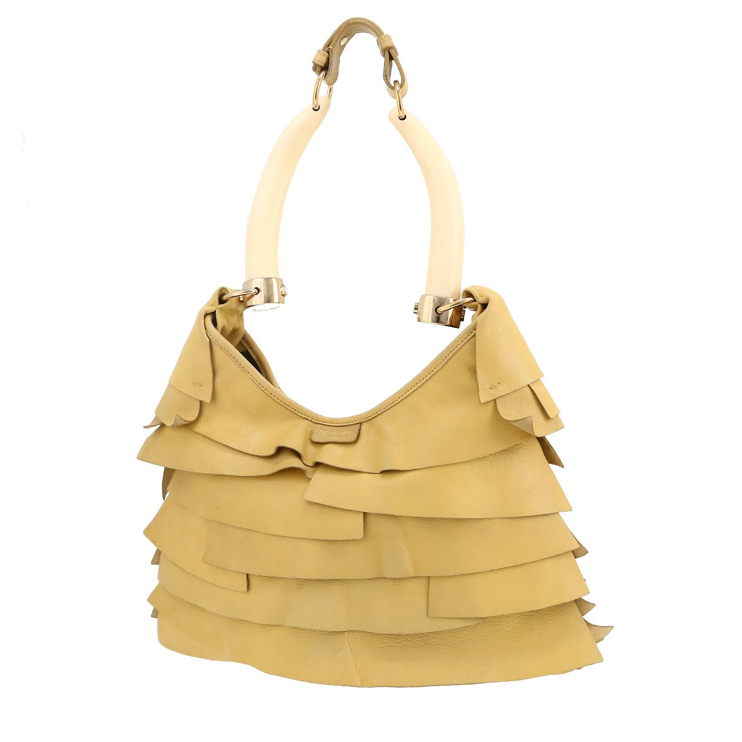 Divertente borsa Saint Laurent Mombasa in pelle giallo, inserti in metallo dorato, manico in corno da portare a mano o in spalla.