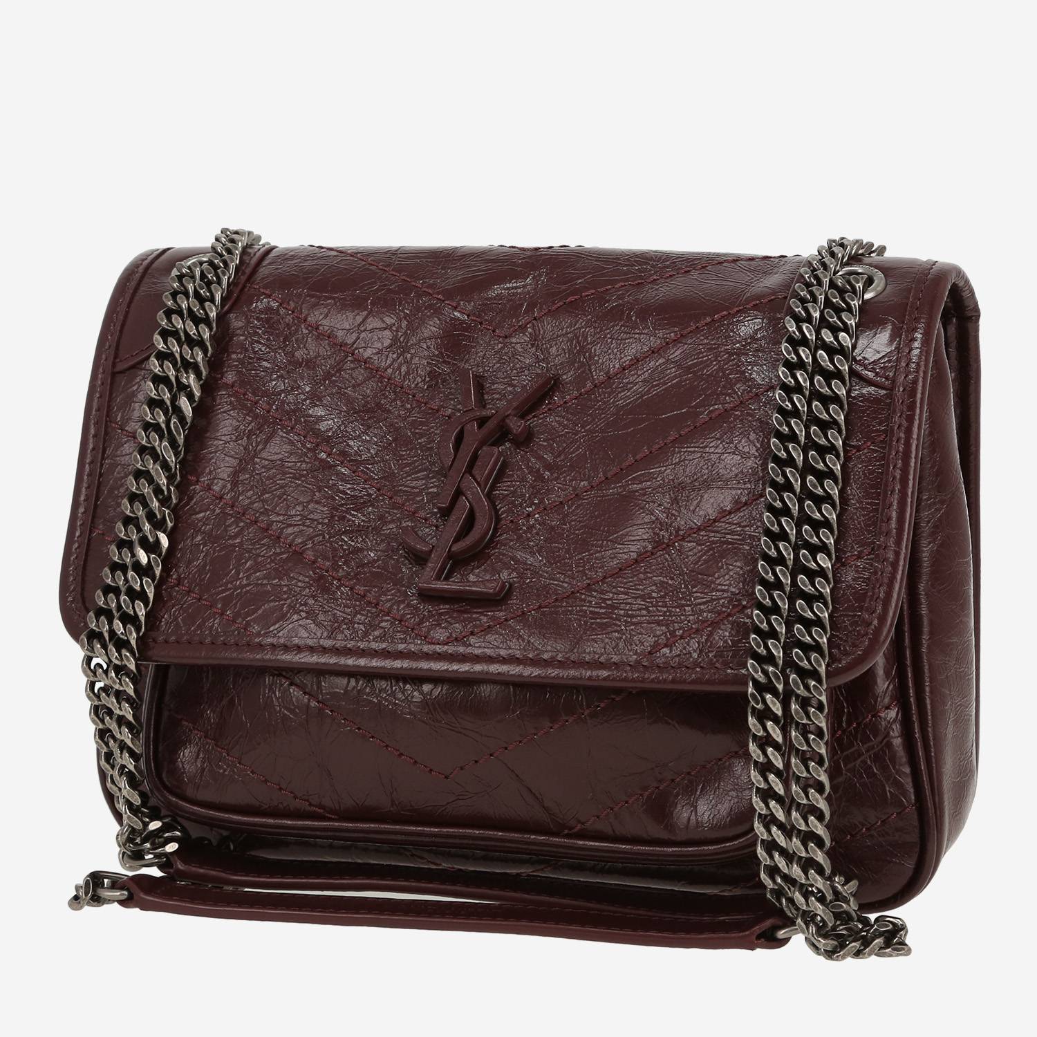 Magnifica borsa a tracolla Saint Laurent Niki Baby in pelle trapuntata a zigzag bordeaux, inserti in metallo argentato invecchiato, doppia tracolla a catena trasformabile in metallo argentato invecchiato da portare in spalla o a tracolla.