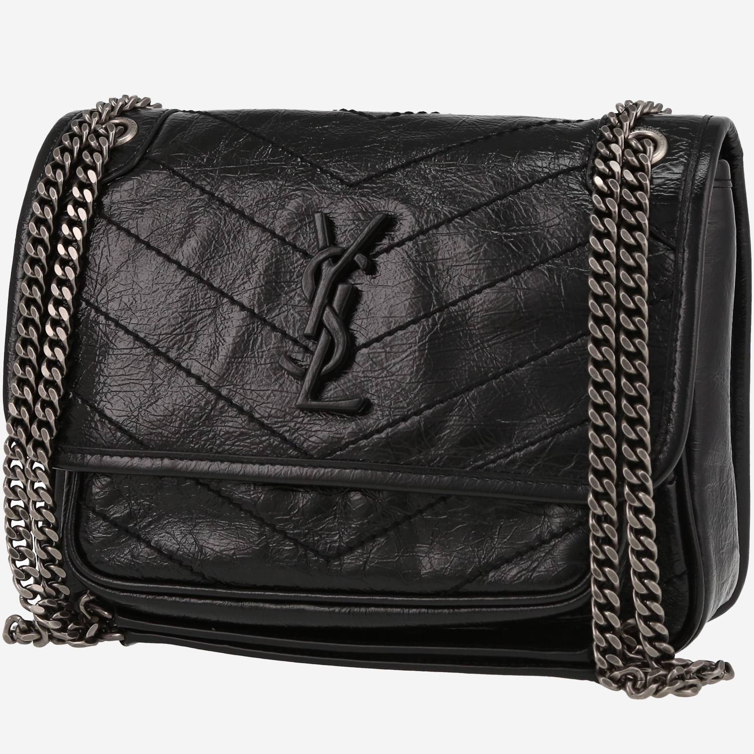 Bellissima borsa a tracolla Saint Laurent Niki Baby in pelle trapuntata a zigzag nero, inserti in metallo argentato, doppia tracolla a catena in metallo argentato da portare in spalla o a tracolla.