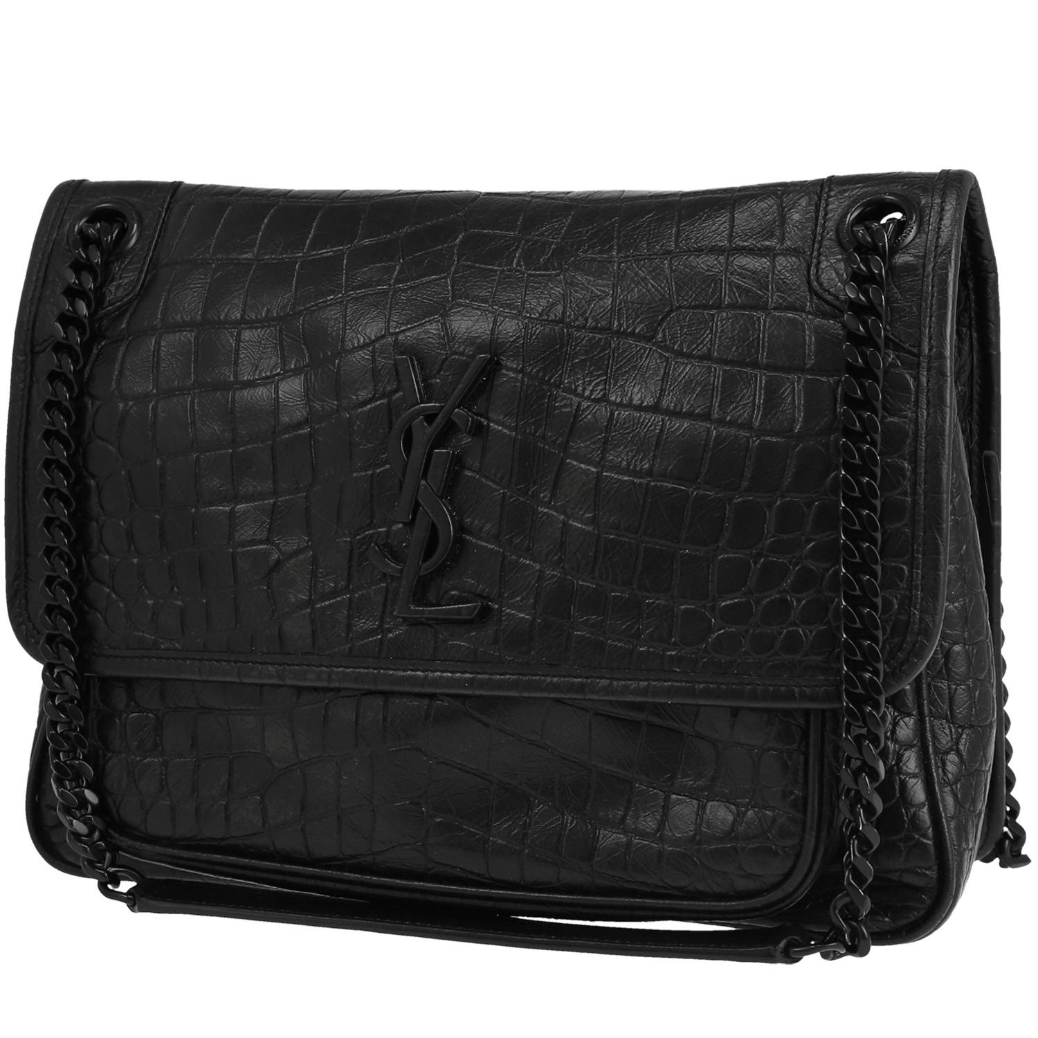 Borsa a tracolla Saint Laurent Niki modello medio in pelle nero simil coccodrillo, inserti in metallo argentato invecchiato, doppia tracolla a catena in metallo argentato invecchiato da portare in spalla o a tracolla.