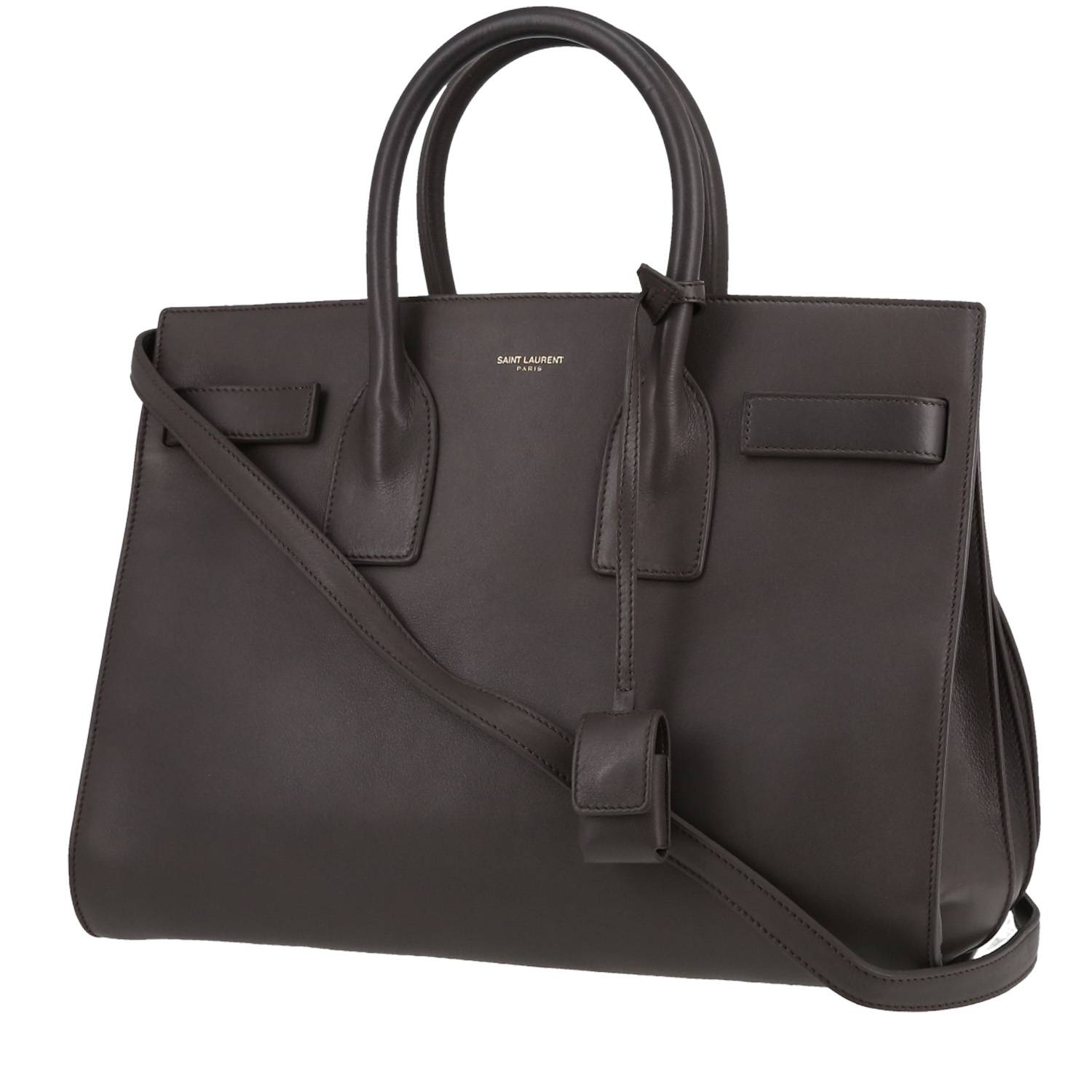 Inimitabile borsa Saint Laurent Sac de jour in pelle grigio, inserti in metallo dorato, doppio manico in pelle grigia, una tracolla removibile in pelle grigia da portare a mano o in spalla.