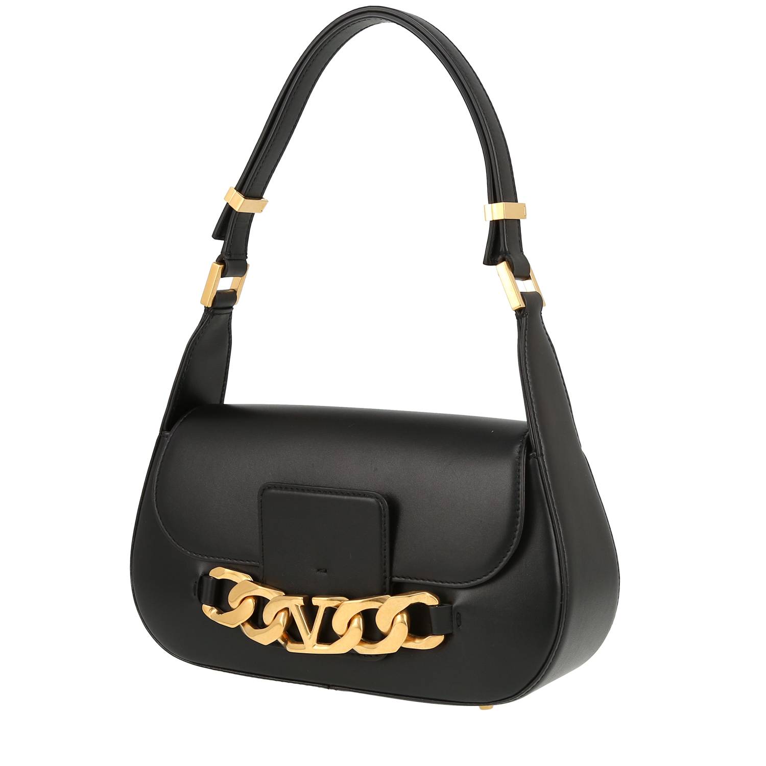 Magnifica borsa Valentino Garavani in pelle liscia nero, inserti in metallo dorato, una tracolla regolabile in pelle nera da portare a mano o in spalla.