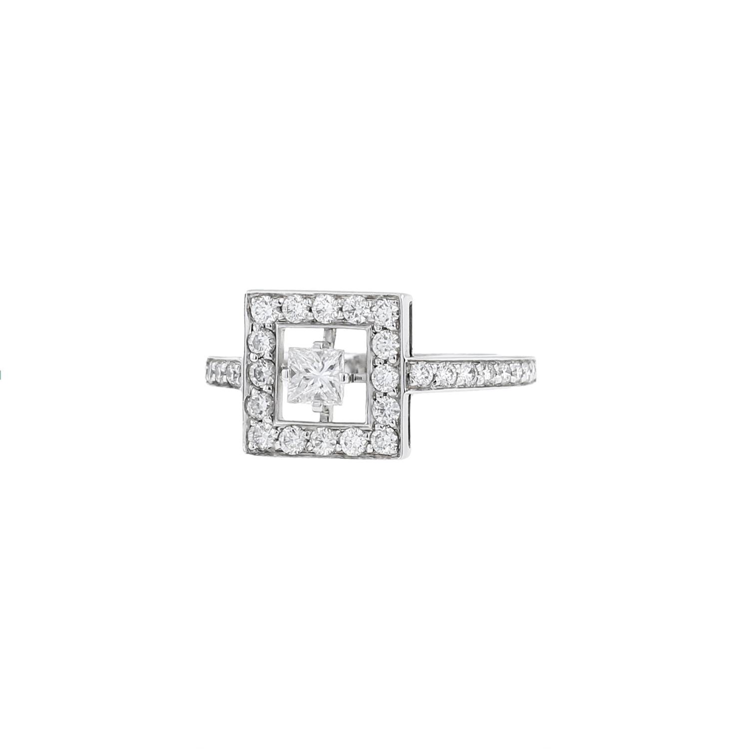 Magnifico anello Boucheron Ava in oro bianco e diamanti, composto undefined in oro bianco parzialmente undefined di diamanti, ornato al centro da un bello diamante con taglio princess del peso circa di 0.25 carati.