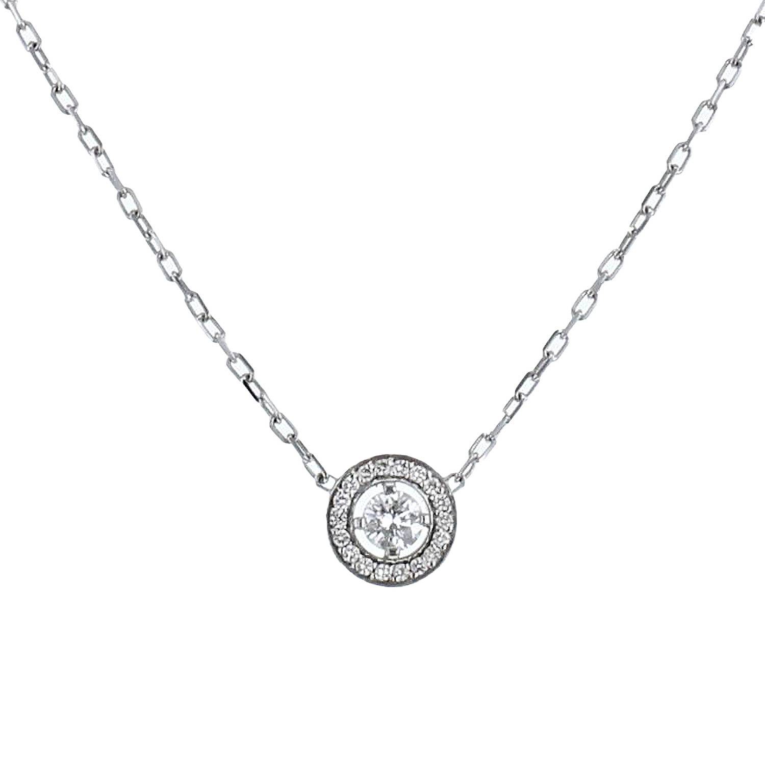 Collana Boucheron Ava in oro bianco e diamanti, composta da una raffinata catena a maglia forzatina in oro bianco, ornata al centro un elegante motivo rotondo traforato delicatamente incastonato di 0,15 carati di diamanti con taglio a brillante, arricchita al centro da un bello diamante con taglio a brillante circa 0.20 carati.
