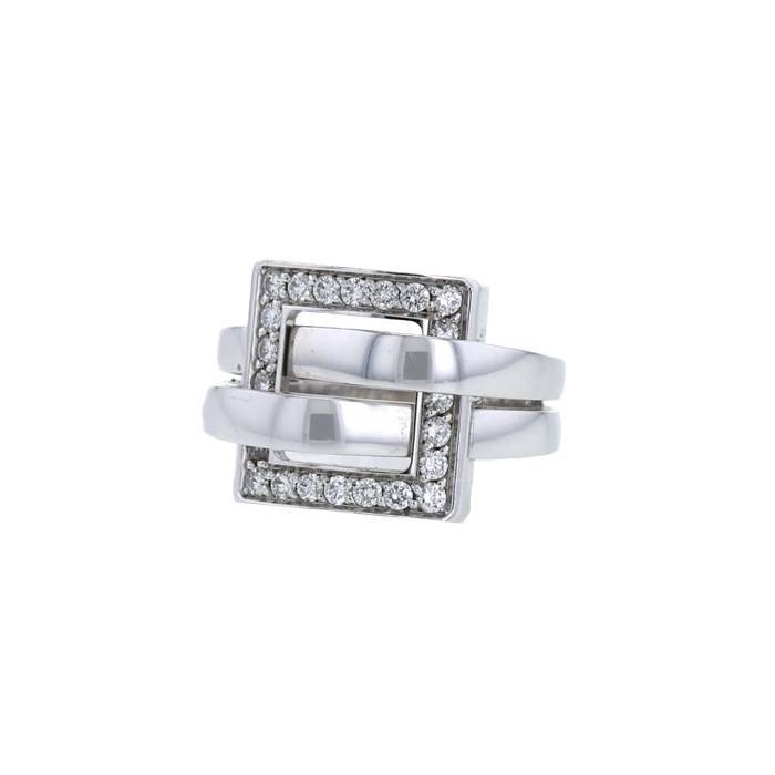 Anello Boucheron Déchainé in oro bianco e diamanti, composto da un elegante motivo quadrato traforato delicatamente incastonato di diamanti con taglio a brillante 0.25 carati di circa, arricchito da una bellissima incrociato.