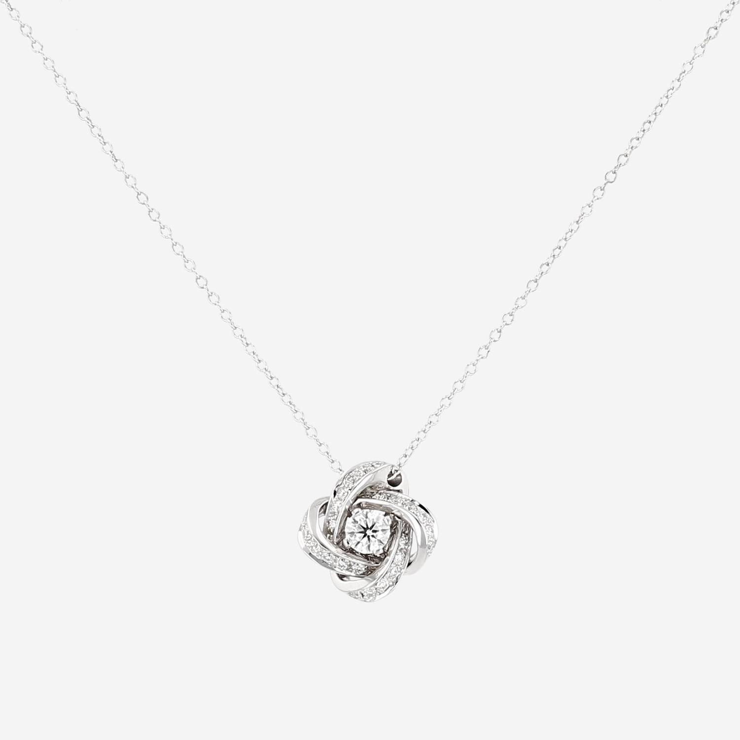 Collana Boucheron Pivoine in oro bianco e diamanti, composta da un motivo ondulato traforato in oro bianco finemente incastonato di diamanti con taglio a brillante 0.20 carati di circa, che sostengono al centro un bellissimo diamante con taglio a brillante del peso circa 0.15 carati, il tutto sostenuto da una sottile catena a maglie forzatine in oro bianco.