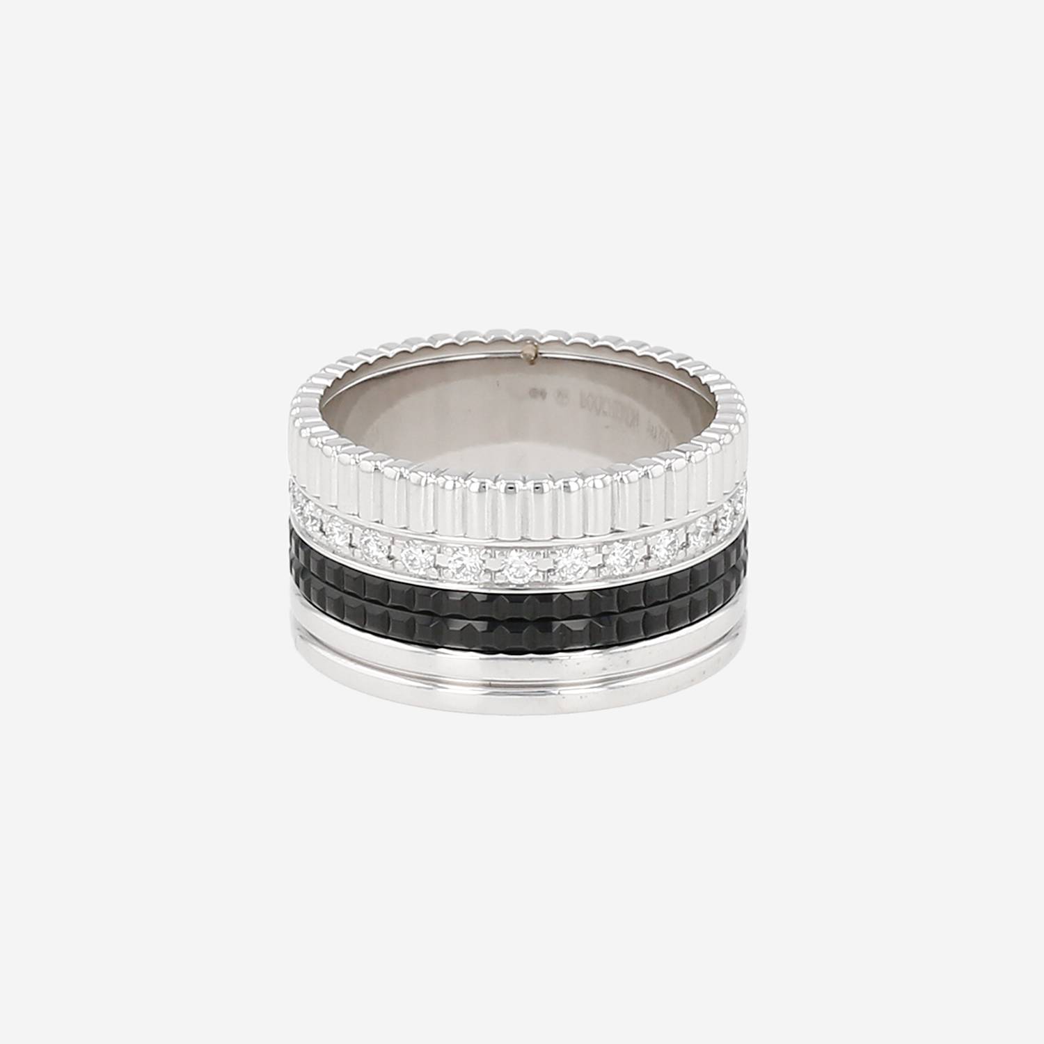 Anello Boucheron Quatre Black Edition modello grande in oro bianco, in diamanti, e PVD nero, composto di 2 montature liscie in oro bianco, da un montatura in oro bianco delicatamente tempestata di diamanti con taglio a brillante, arricchita di 2 montature testurizzate in PVD nero e da un montatura godronata in oro bianco.