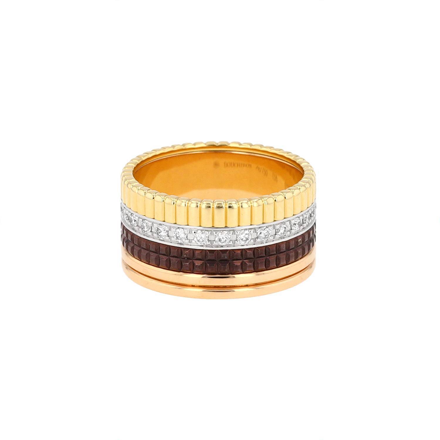 Anello Boucheron Quatre modello grande in 3 ori, in diamanti, e PVD, composto da un montatura in oro bianco elegantemente tempestata di diamanti con taglio a brillante 0.50 carati di circa e da un montatura godronata in oro giallo e da un montatura godronata in oro rosa, arricchito al centro da un elegante montatura geometrica testurizzata in PVD marrone.