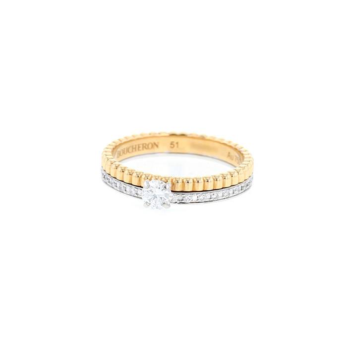 Anello Boucheron Quatre Radiant Edition in oro giallo, in oro bianco, e diamanti, composto da un montatura in oro bianco parzialmente incastonata di diamanti con taglio a brillante 0.15 carati di circa e da un montatura godronata in oro giallo, che sostengono al centro un bello diamante con taglio a brillante del peso circa 0.20 carati.