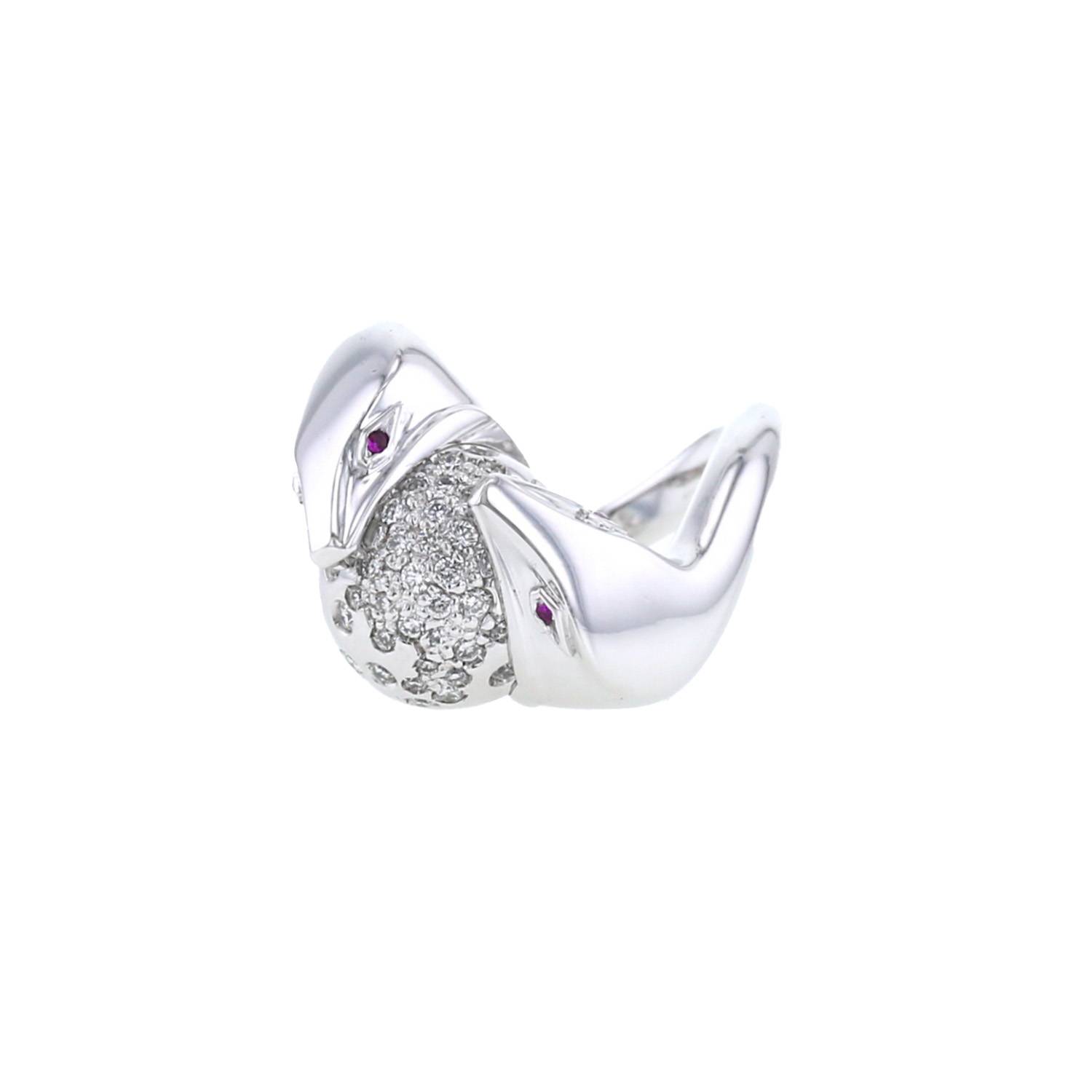 Splendido anello Boucheron Trouble in oro bianco, in diamanti, e rubini, dotato di 2 serpenti intrecciati delicatamente incastonati di rubini, che sostengono al centro una sfera delicatamente incastonata di diamanti con taglio a brillante.