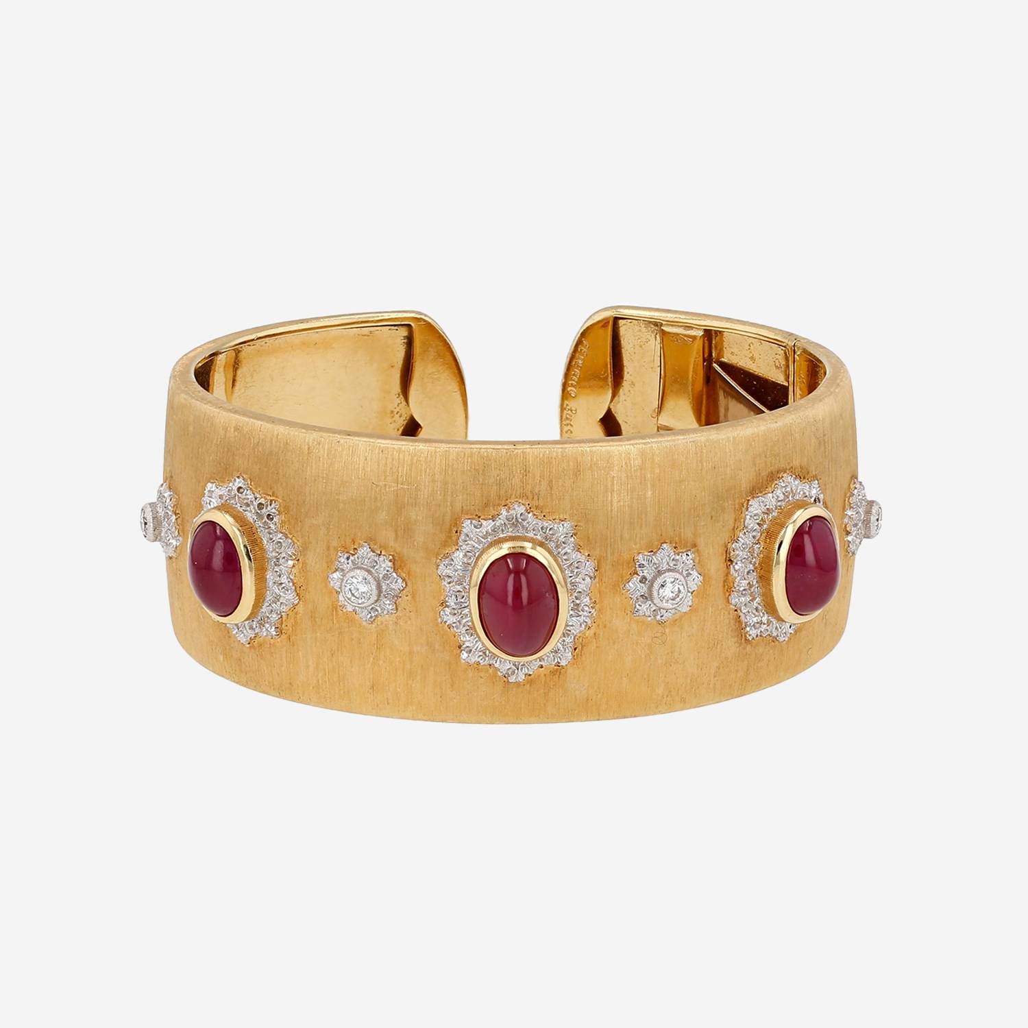 Bracciale Buccellati Macri in oro giallo con decorazione ghiglioscé , in oro bianco, e rubini, composto da una importante fascia testurizzata in oro giallo, ornato di belli cabochon in rubini arricchiti di motivi testurizzati in oro bianco, circondato di diamanti con taglio a brillante circa 0.40 carati.