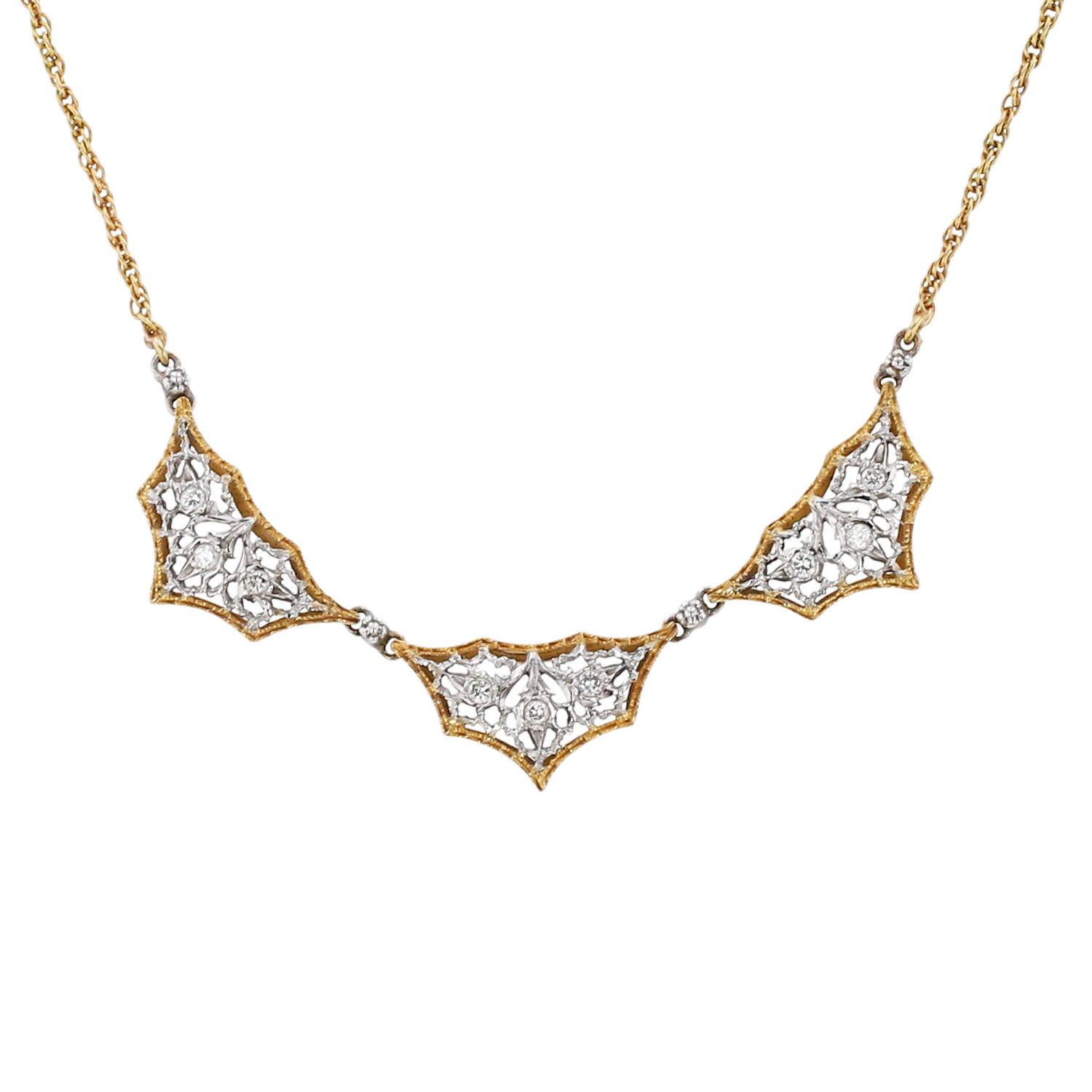 Collana Mario Buccellati in oro giallo, in oro bianco, e diamanti, composta di 3 motivi traforate in oro bianco delicatamente incastonati di diamanti con taglio a brillante 0.10 carati di circa, arricchita da una bello bordo testurizzato in oro giallo, il tutto sostenuto da una catena in oro giallo.