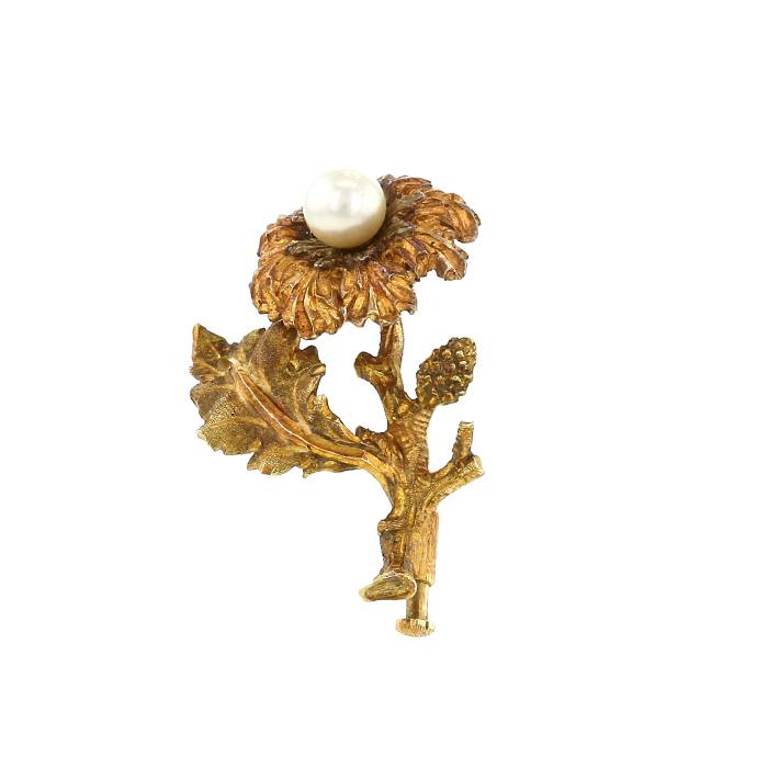 Spilla Buccellati in oro giallo e perla coltivata, dotata di un raffinato fiore testurizzato in oro giallo, ornata al centro da una bella perla.