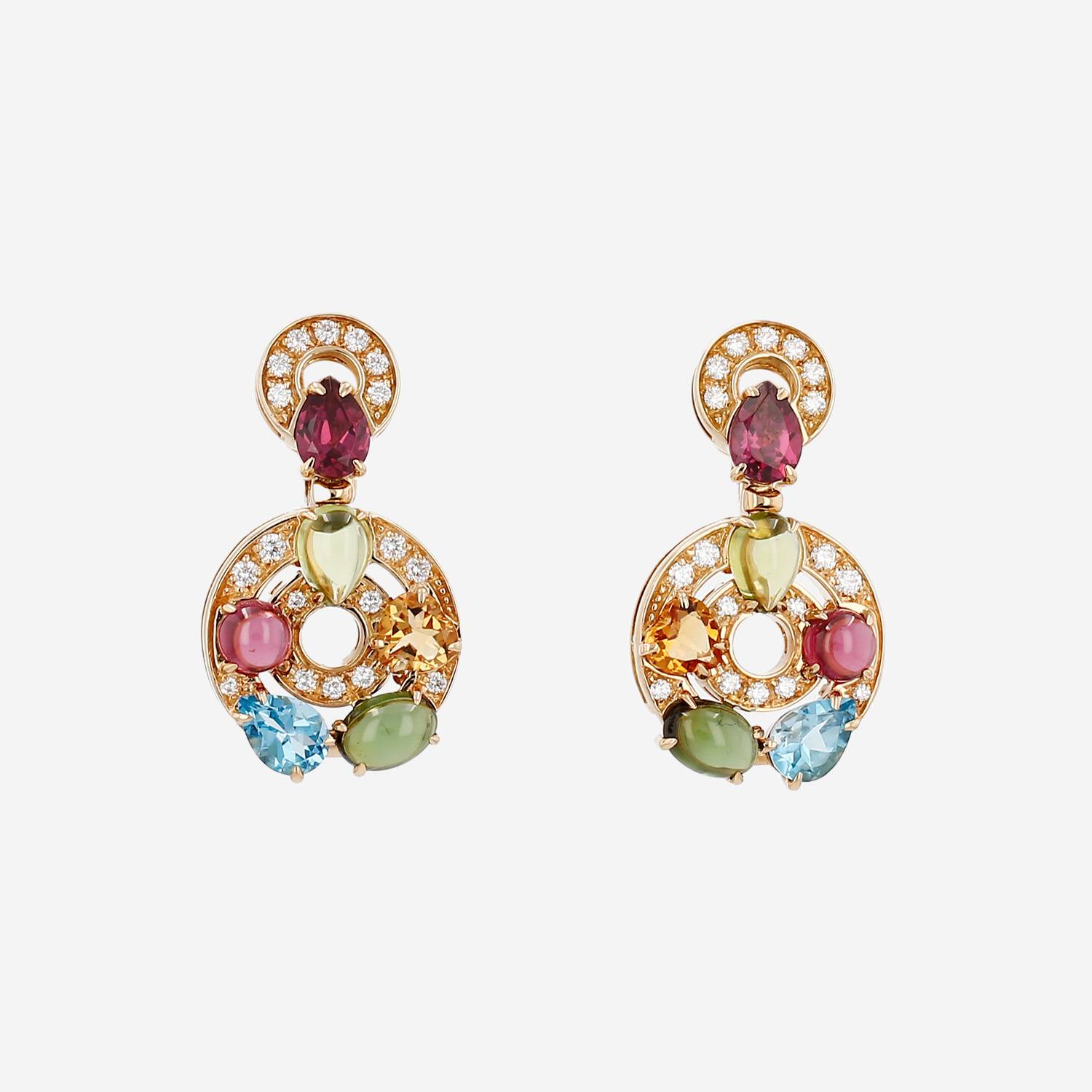 Orecchini semi-mobili Bulgari Astrale in oro giallo, in pietre colorate, e diamanti, elegantemente incastonati di tormaline e di peridoto con taglio cabochon, da una granato a da topazio blu con taglio a pera e da un citrino formato cuore composti da una successione di motivo rotondo traforato tempestato di diamanti con taglio a brillante 0.25 carati di circa.