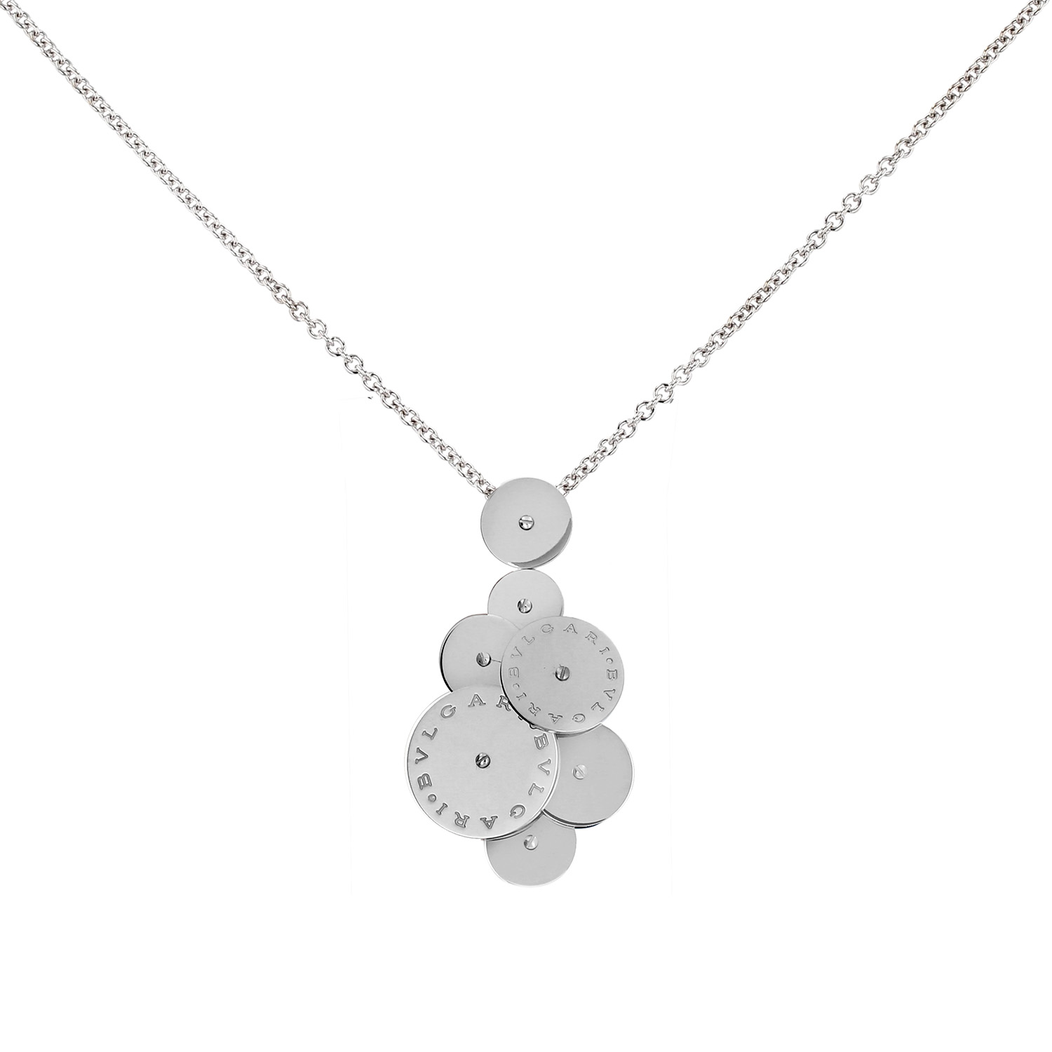 Collana Bulgari Cyclades modello grande in oro bianco, composta da una sovrapposizione di dischi rotonde girevoli in oro bianco, ornata da una elegante incisione "Bvlgari Bvlgari", il tutto sostenuto da una catena in oro bianco.