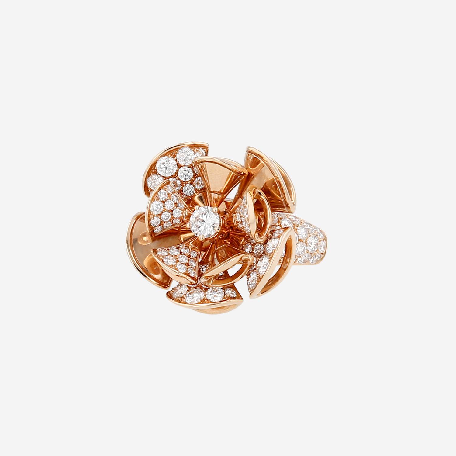 Anello Bulgari Divas' Dream in oro rosa e diamanti, con una raffinato fiore ondulato semi-mobile in oro rosa parzialmente tempestato di diamanti con taglio a brillante 0.70 carati di circa, che sostengono al centro un bellissimo diamante con taglio a brillante del peso totale 0.20 carati, arricchito da un montatura parzialmente tempestata di diamanti con taglio a brillante circa 0.50 carati.