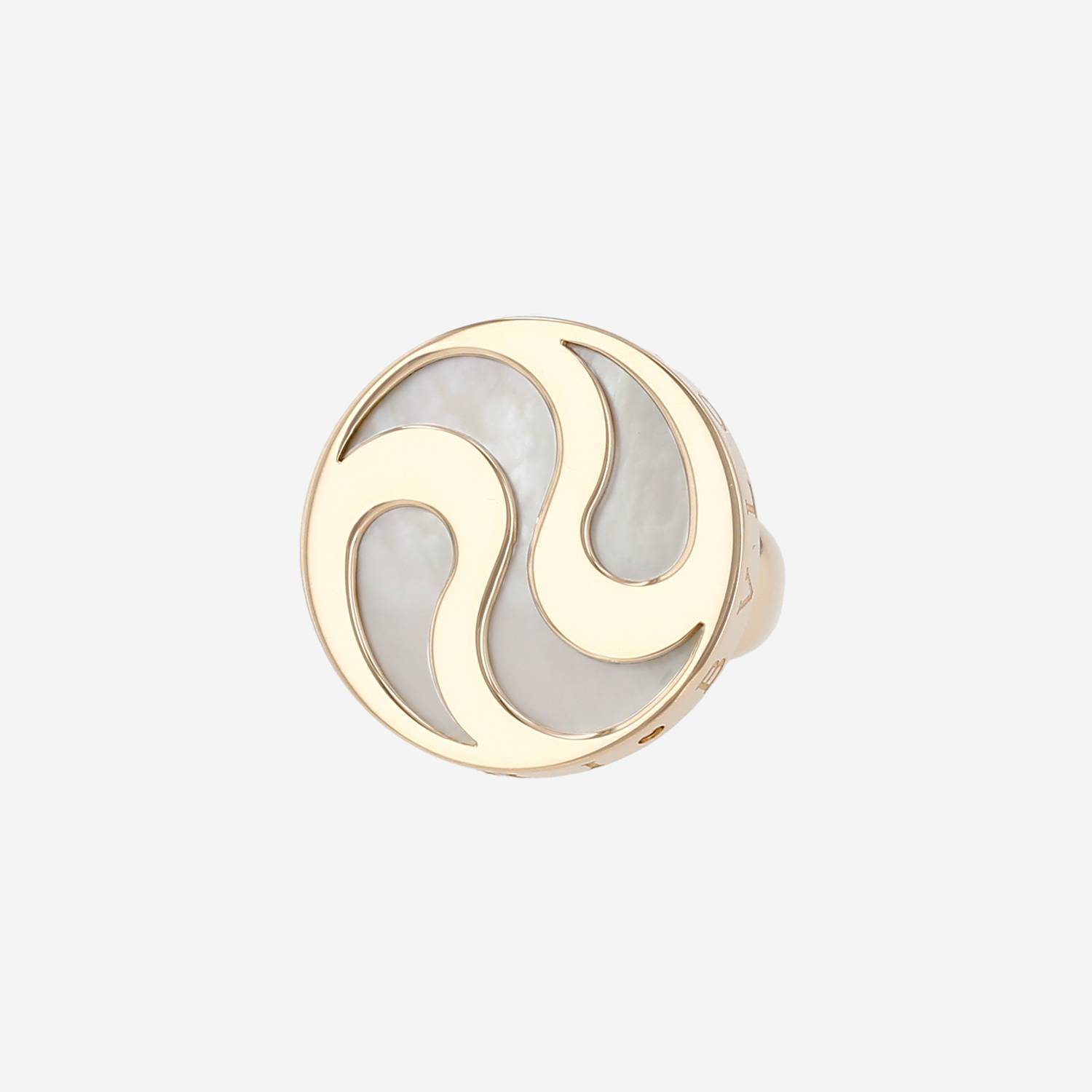 Anello Bulgari Optical in oro giallo, in acciaio, e madreperla (Turbo Marmoratus), composto da un disco girevole in oro giallo, in madreperla (Turbo Marmoratus).