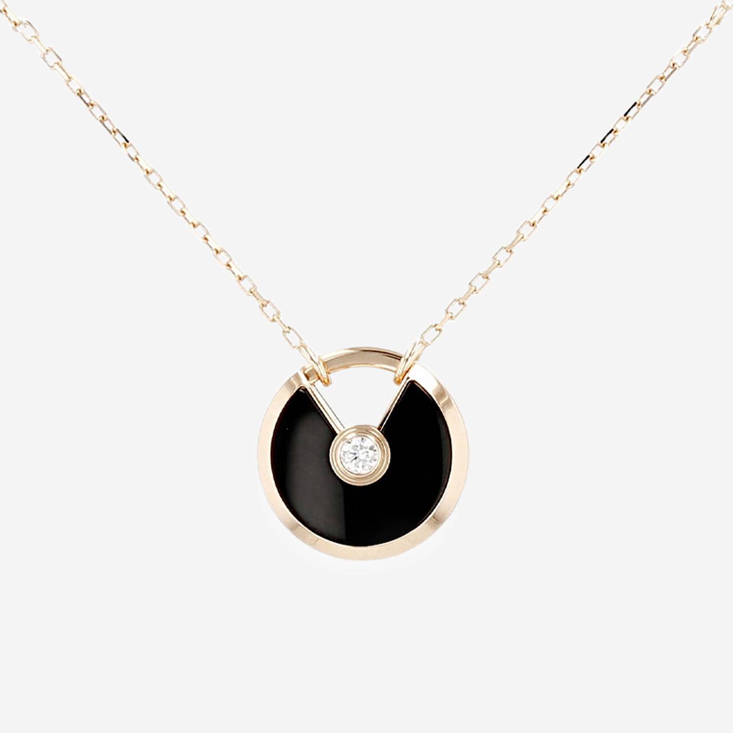 Collana Cartier Amulette modello piccolo in oro rosa, in onice, e diamante, composta da un bellissimo motivo rotondo traforato in oro rosa, in onice incastonato da un diamante con taglio a brillante, il tutto sostenuto da una raffinata catena in oro rosa.