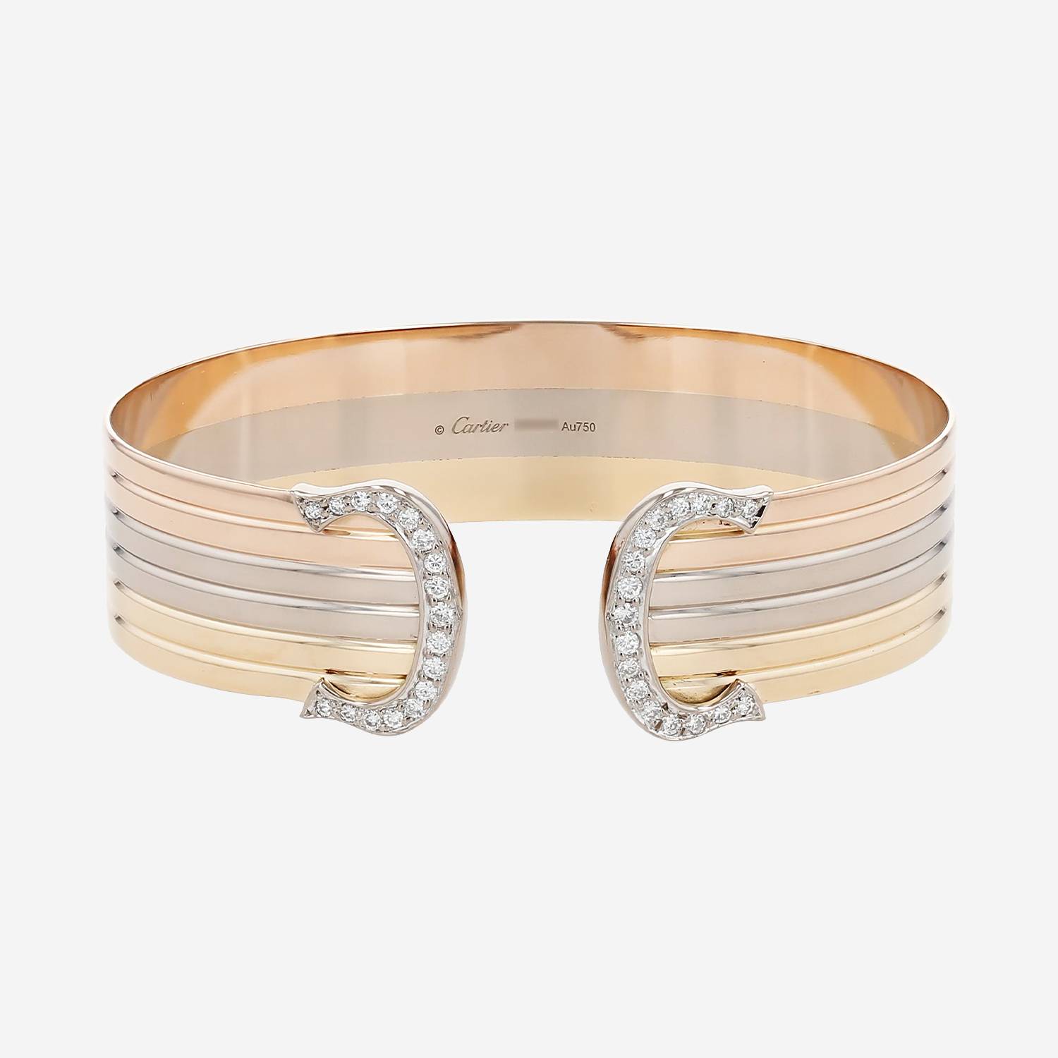Bracciale Cartier C de Cartier in 3 ori e diamanti, composto da un profilo godronato aperto in oro giallo, in oro bianco e oro rosa, ornato del doppia C Cartier delicatamente incastonata di diamanti con taglio a brillante.