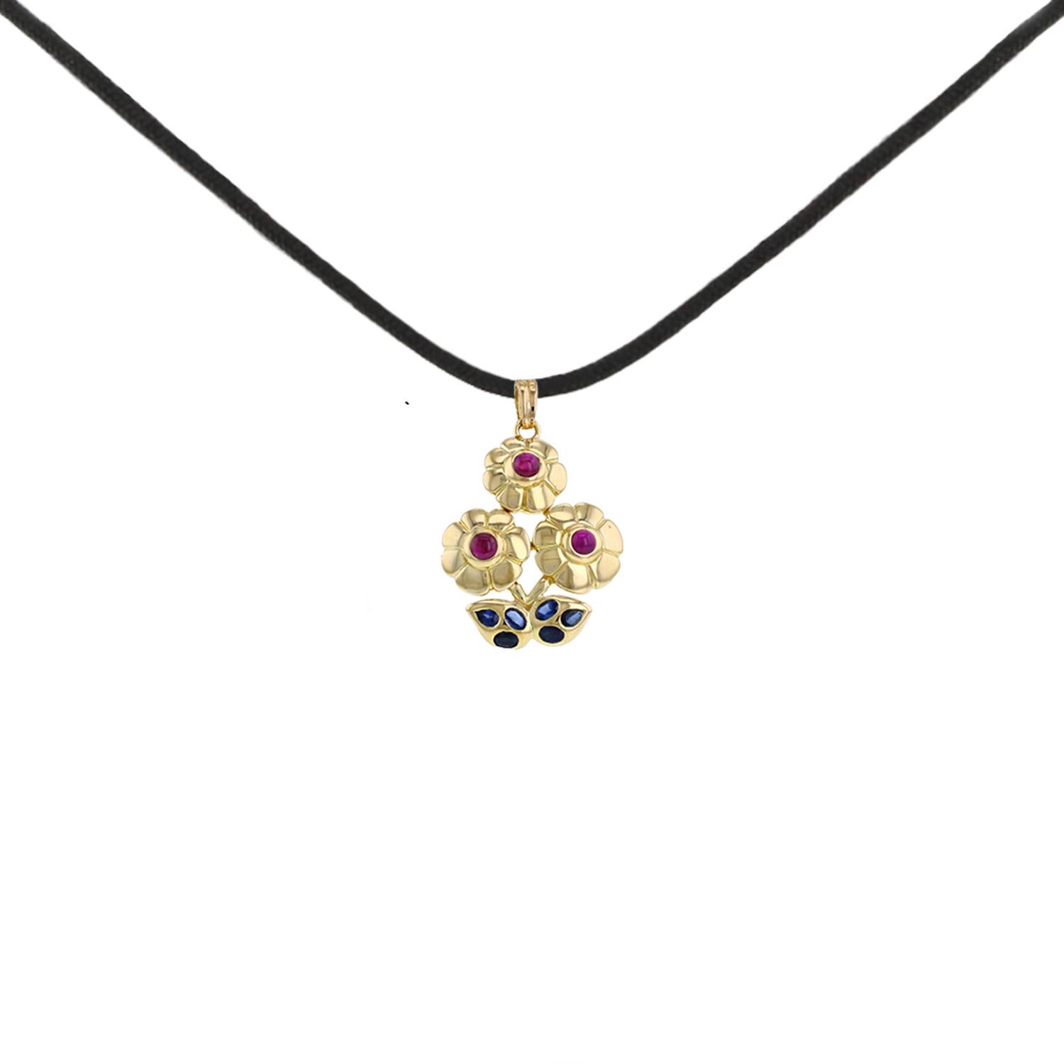 Ciondolo Cartier in oro giallo, in rubini, e zaffiri, dotato di di bellissimi fiori in oro giallo, ornato al centro di rubino con taglio cabochon, arricchito alla base di foglie incastonate di zaffiri.