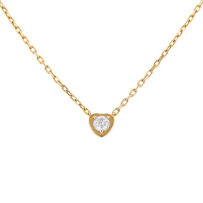 Bellissima collana Cartier in oro giallo e diamante, composta da una catena a maglia forzatina in oro giallo, che sostengono un raffinato cuore bombato in oro giallo delicatamente incastonato di un diamante con taglio a brillante 0,15 ct..