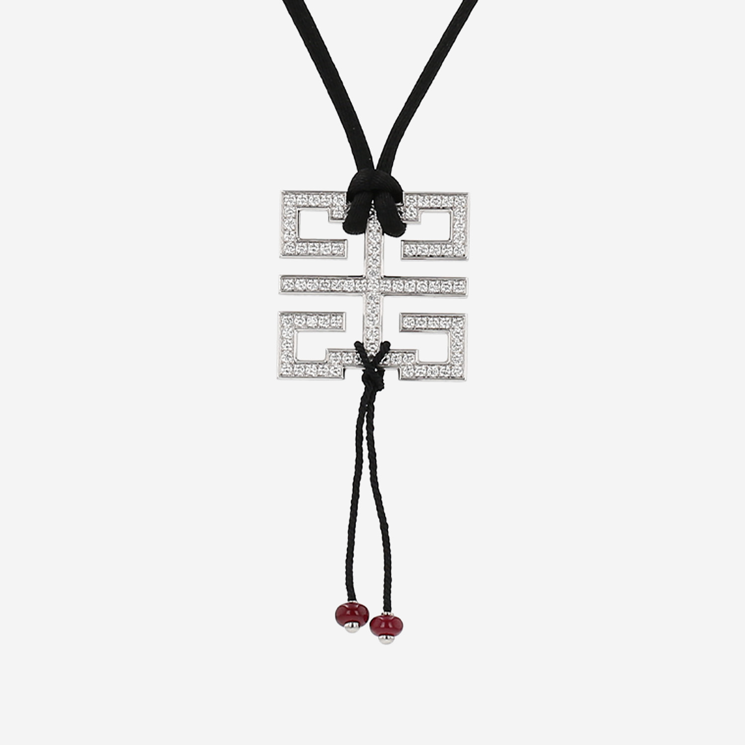 Collana Cartier Le Baiser du Dragon in oro bianco, in diamanti, e rubini, composta di magnifici motivi cilindrici traforate in oro bianco delicatamente tempestati di diamanti con taglio a brillante di circa 1.80 carati in totale, che sostengono bellissimi perle in rubini, il tutto sostenuto da cordoncino di passamaneria.