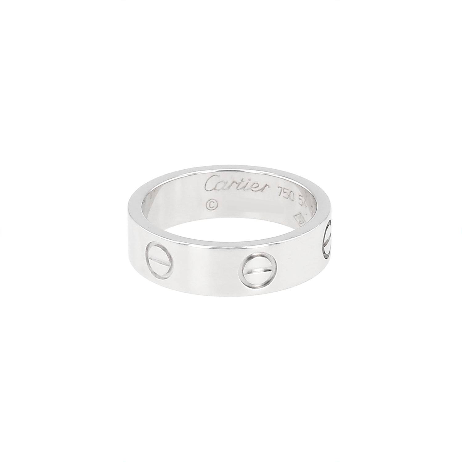 Anello Cartier Love in oro bianco, composto da un elegante fascia liscia in oro bianco, ornato di motivi a vite incisi.