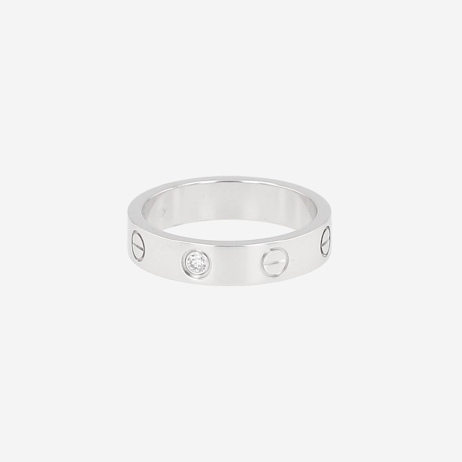 Anello Cartier Love modello piccolo in oro bianco e diamante, composto da un elegante fascia liscia in oro bianco, ornato di motivi a vite incisi, arricchito da un diamante con taglio a brillante circa 0.02 carati incastonato chiuso.