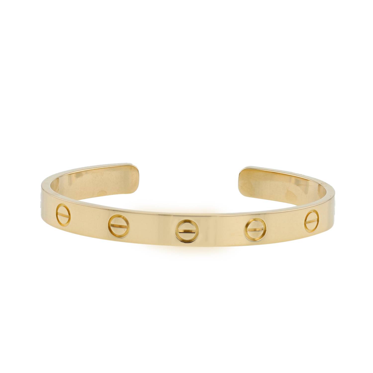 Bracciale aperto Cartier Love ouvert in oro giallo, composto da un fascia liscia, arricchito di motivi a vite incisi.