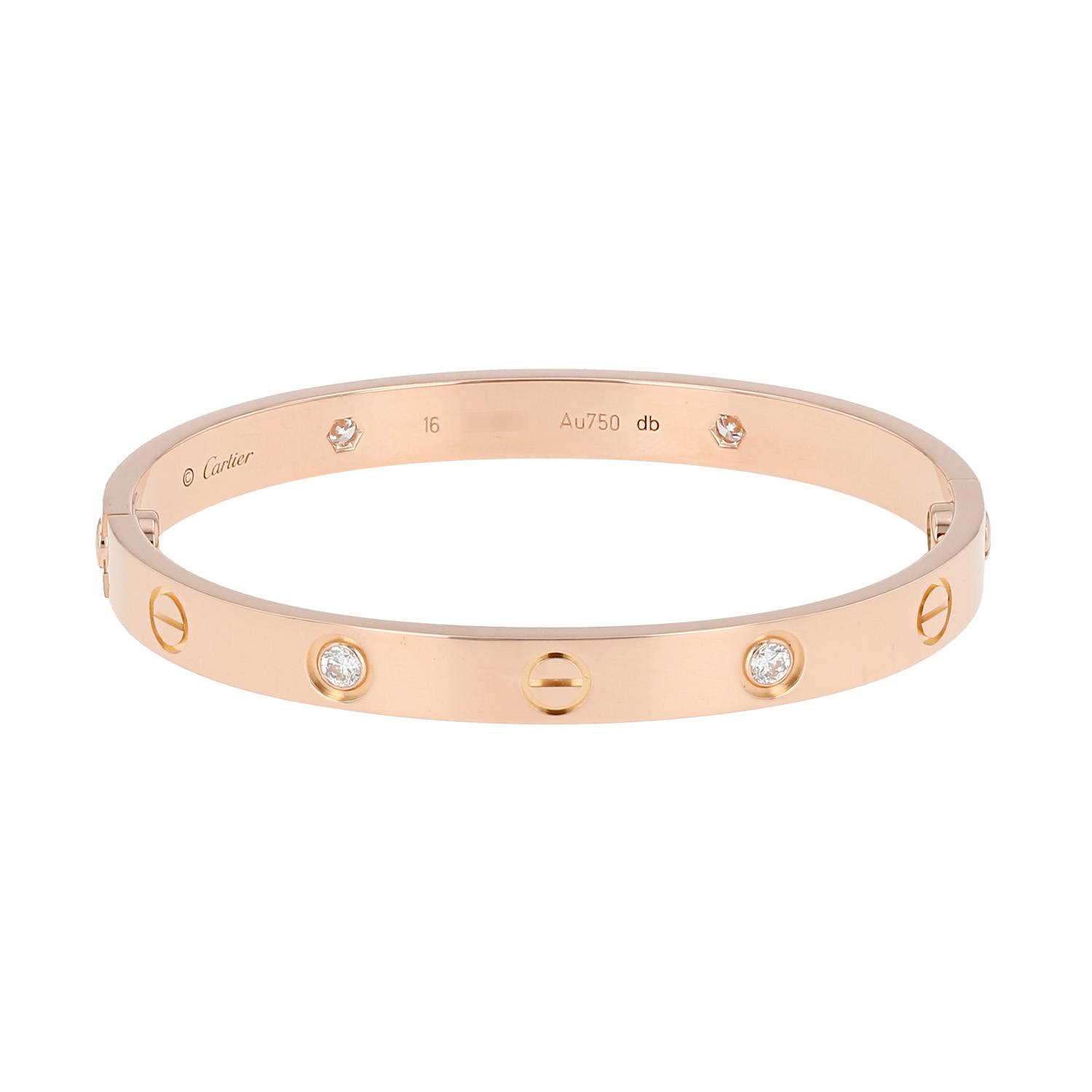 Bracciale Cartier Love 4 diamants in oro rosa e diamanti, composto da un elegante fascia liscia, ornato di motivi a vite incisi arricchite di 4 diamanti con taglio a brillante.