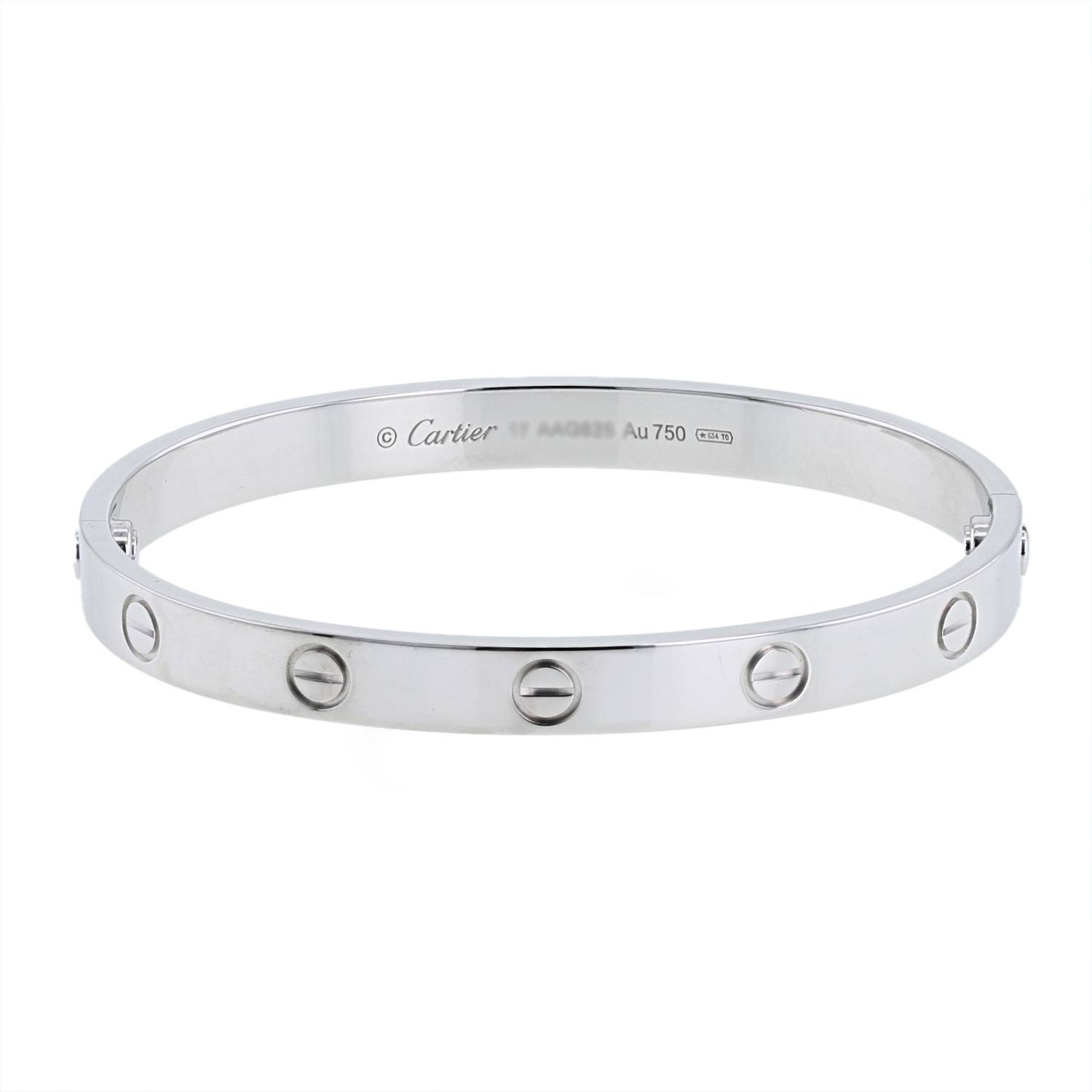 Bracciale Cartier Love in oro bianco, composto da un elegante fascia liscia, ornato di motivi a vite incisi.