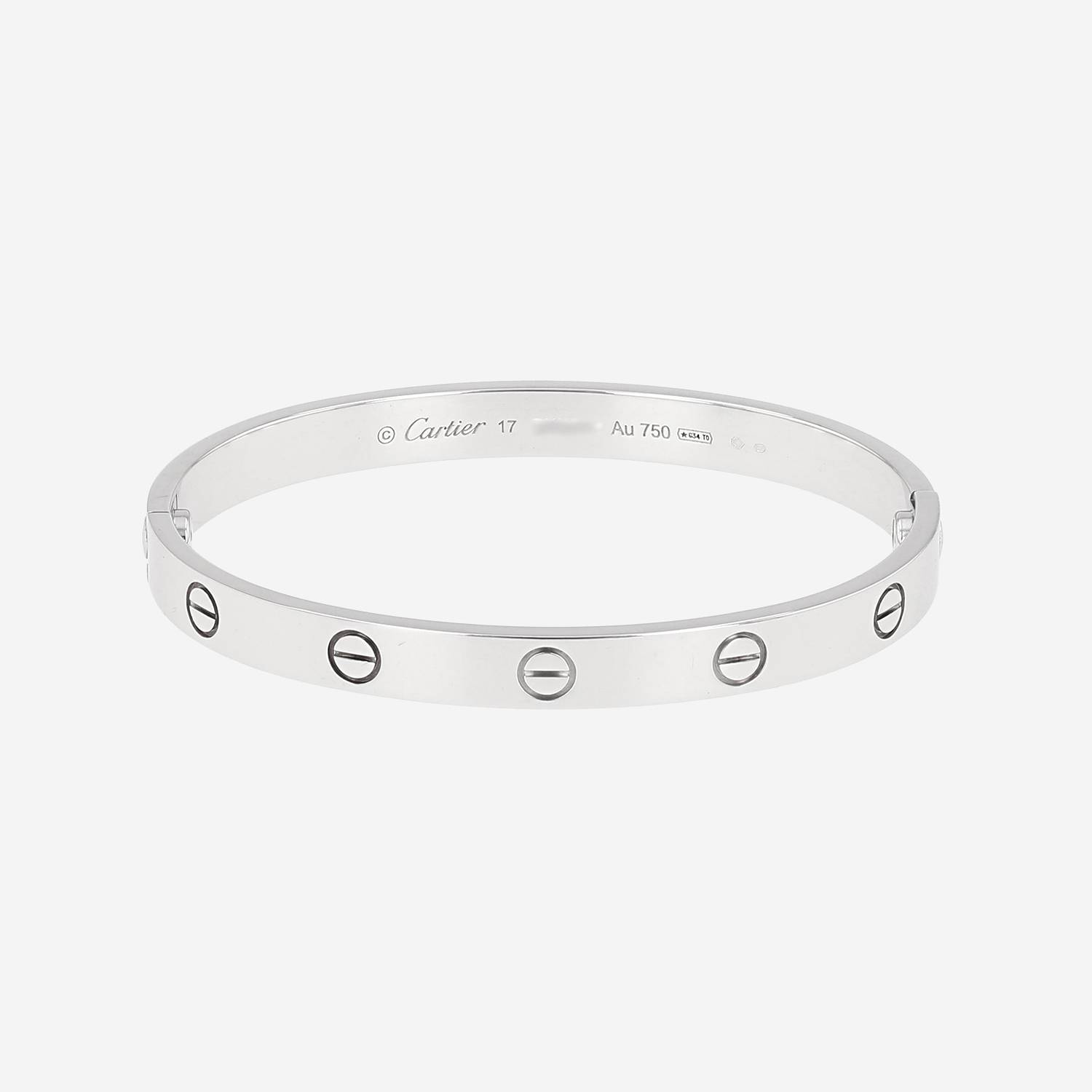 Bracciale Cartier Love in oro bianco, composto da un elegante fascia liscia, ornato di motivi a vite incisi.