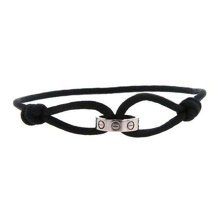 Bellissimo bracciale Cartier Love in oro bianco e seta nera, composto al centro di un incantevoli motivi ovali liscii in oro bianco, ornato da 8 motivi a vite incisi, il tutto sostenuto da un elegante cordoncino in seta nera.