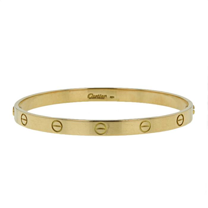 Splendido bracciale della collezione "Love" in oro giallo, composto da una elegante fascia liscia, ornato da motivi a vite incisi.