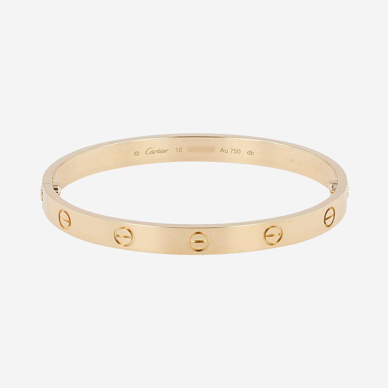 Bracciale Cartier Love in oro giallo, composto da un elegante fascia liscia, ornato di motivi a vite incisi.