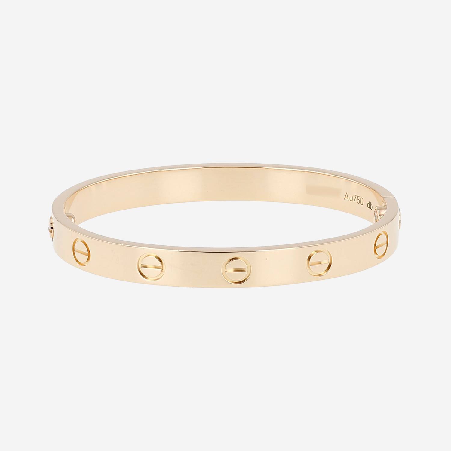 Bracciale Cartier Love in oro giallo, composto da un elegante fascia liscia in oro giallo, ornato di motivi a vite incisi.