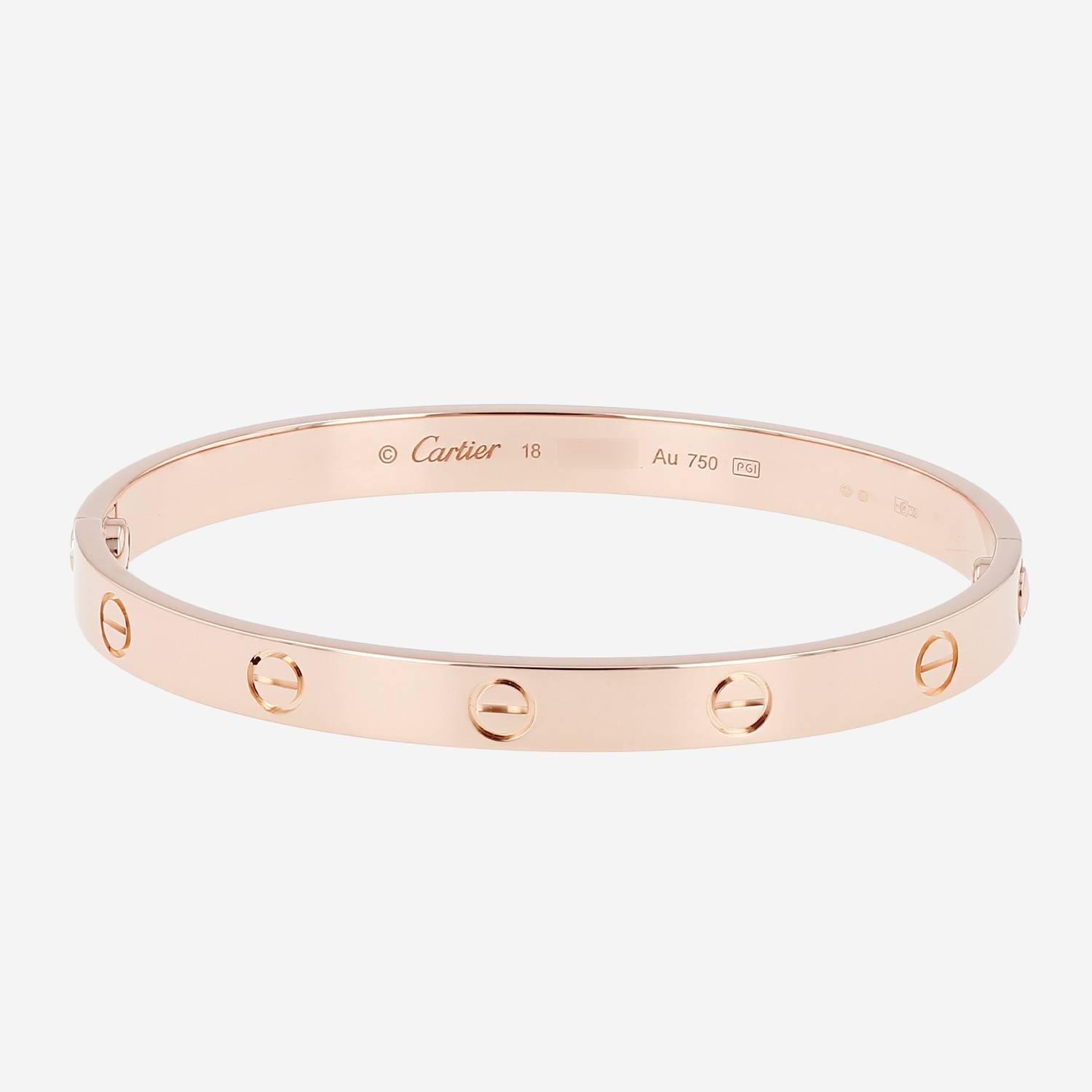 Bracciale Cartier Love in oro rosa, composto da un elegante fascia liscia in oro rosa, ornato di motivi a vite incisi.