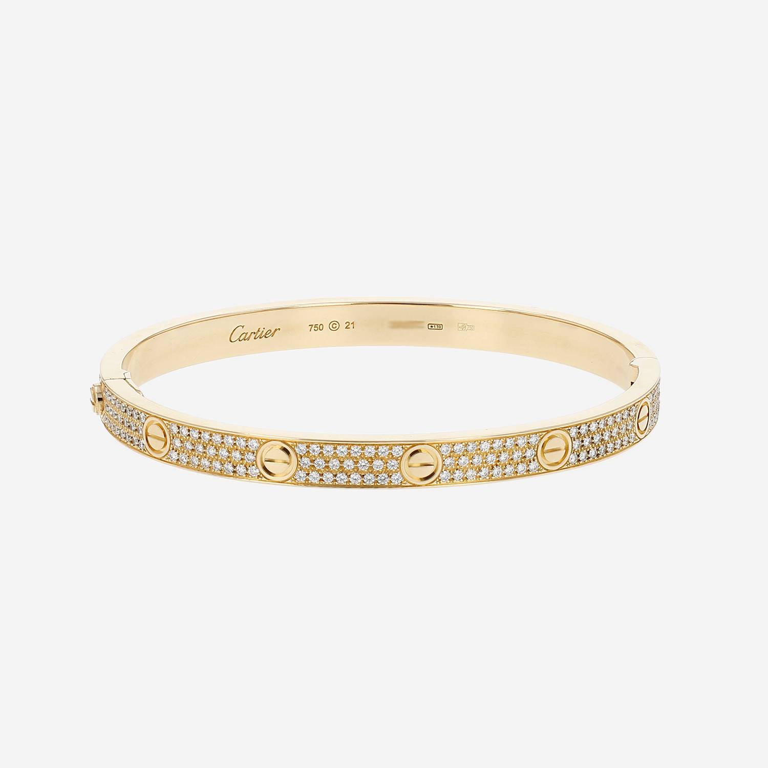 Bracciale Cartier Love pavé in oro giallo e diamanti, composto da un elegante profilo apribile in oro giallo, ornato di 276 splendidi diamanti con taglio a brillante del peso circa 5 carati in totale, arricchito di belle motivi a vite incisi.