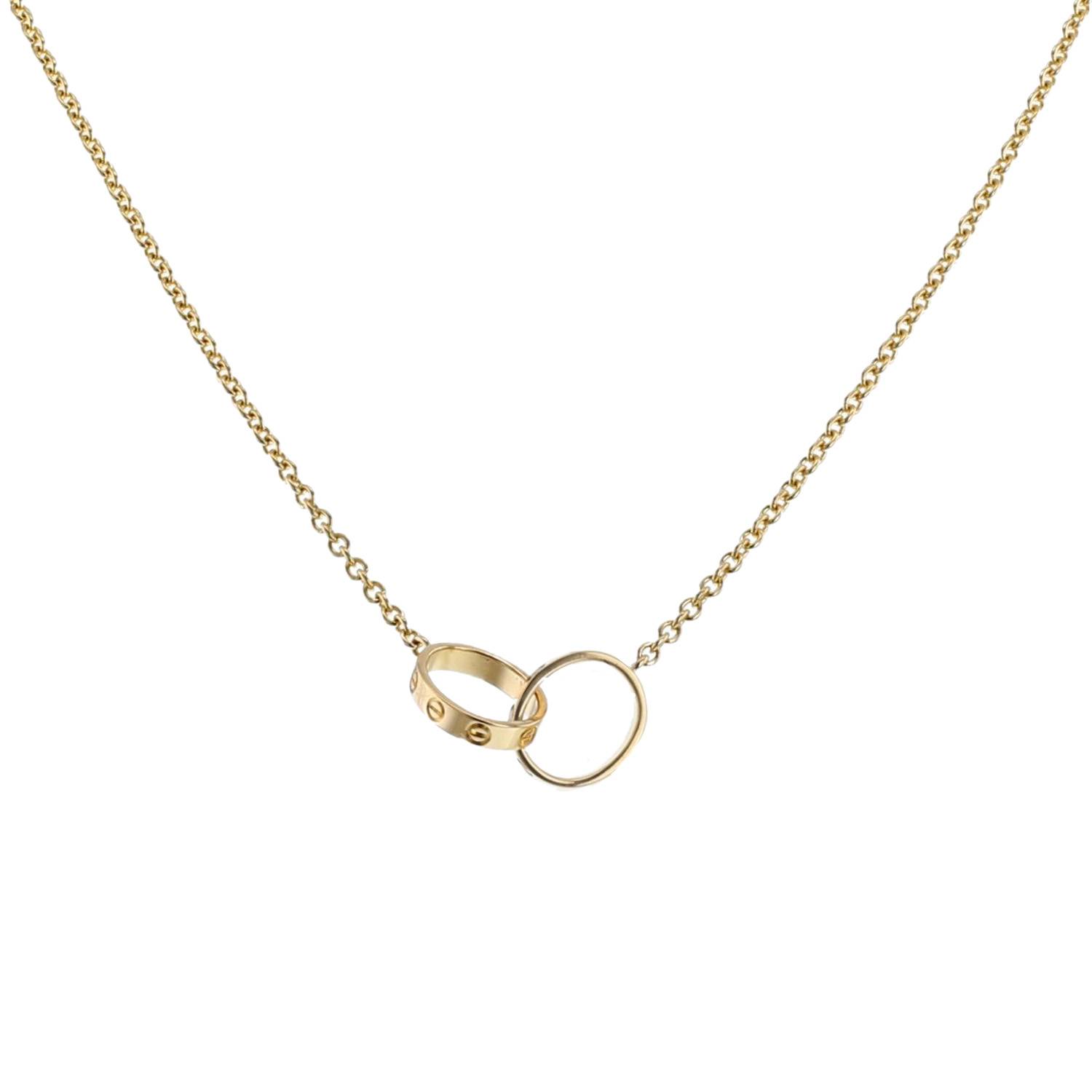 Collana Cartier Love in oro giallo, composta di 2 eleganti motivi ovali intrecciati in oro giallo, ornata di motivi a vite incisi, il tutto sostenuto da una catena in oro giallo.
