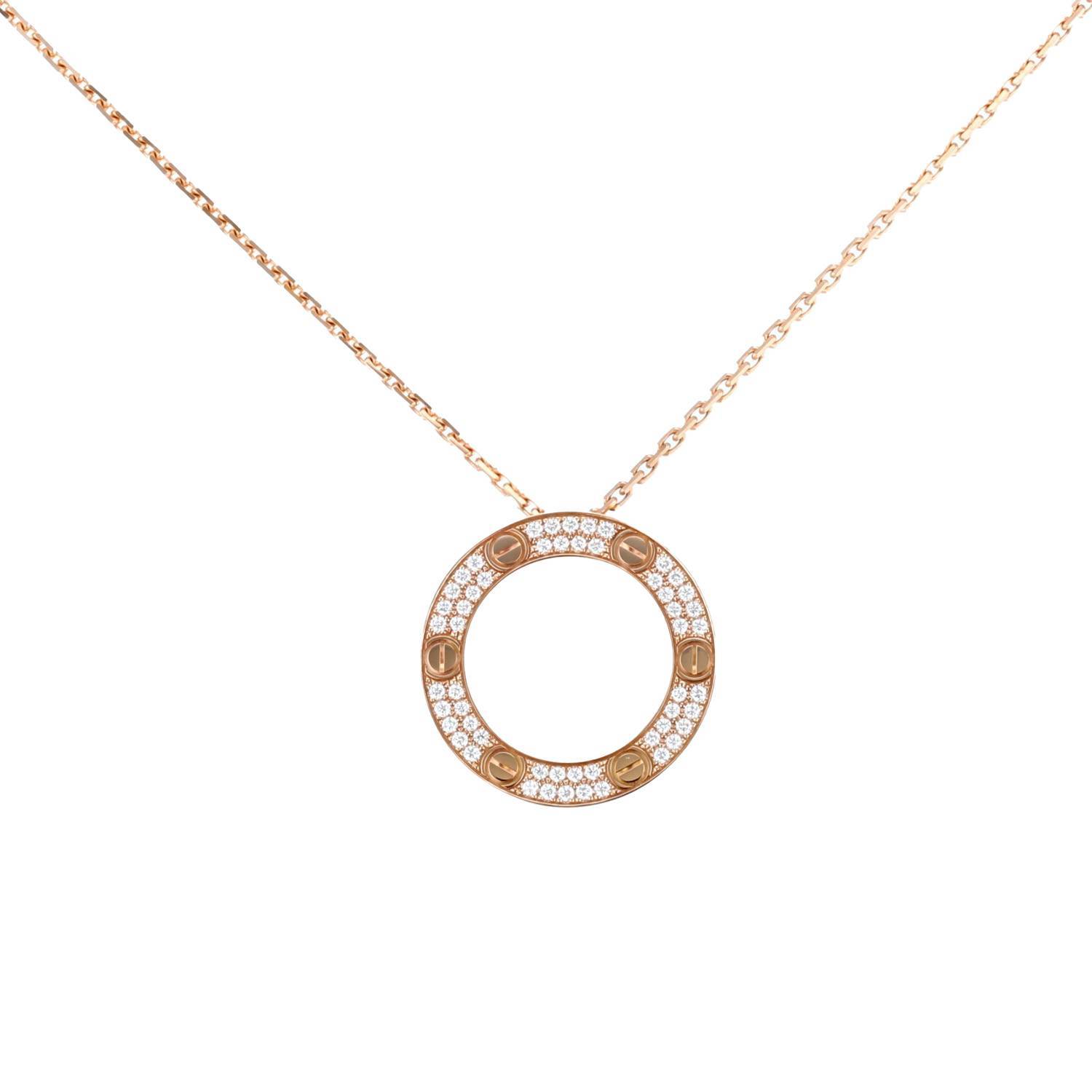 Magnifica collana Cartier Love pavé in oro rosa e diamanti, composta da un elegante motivo apribile in oro rosa, ornata di splendidi diamanti con taglio a brillante, il tutto sostenuto da una catena a maglie forzatine in oro rosa.