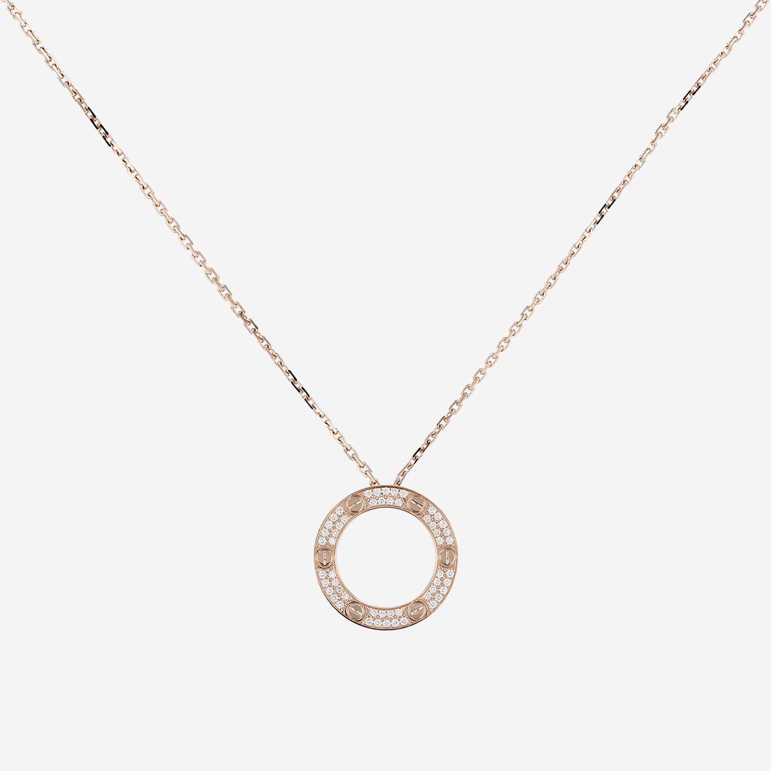Collana Cartier Love pavé in oro rosa e diamanti, composta da un elegante motivo traforato in oro rosa incastonato di diamanti con taglio a brillante di 0.34 carati circa, ornata di motivi a vite incisi, il tutto sostenuto da una catena a maglie forzatine in oro rosa.