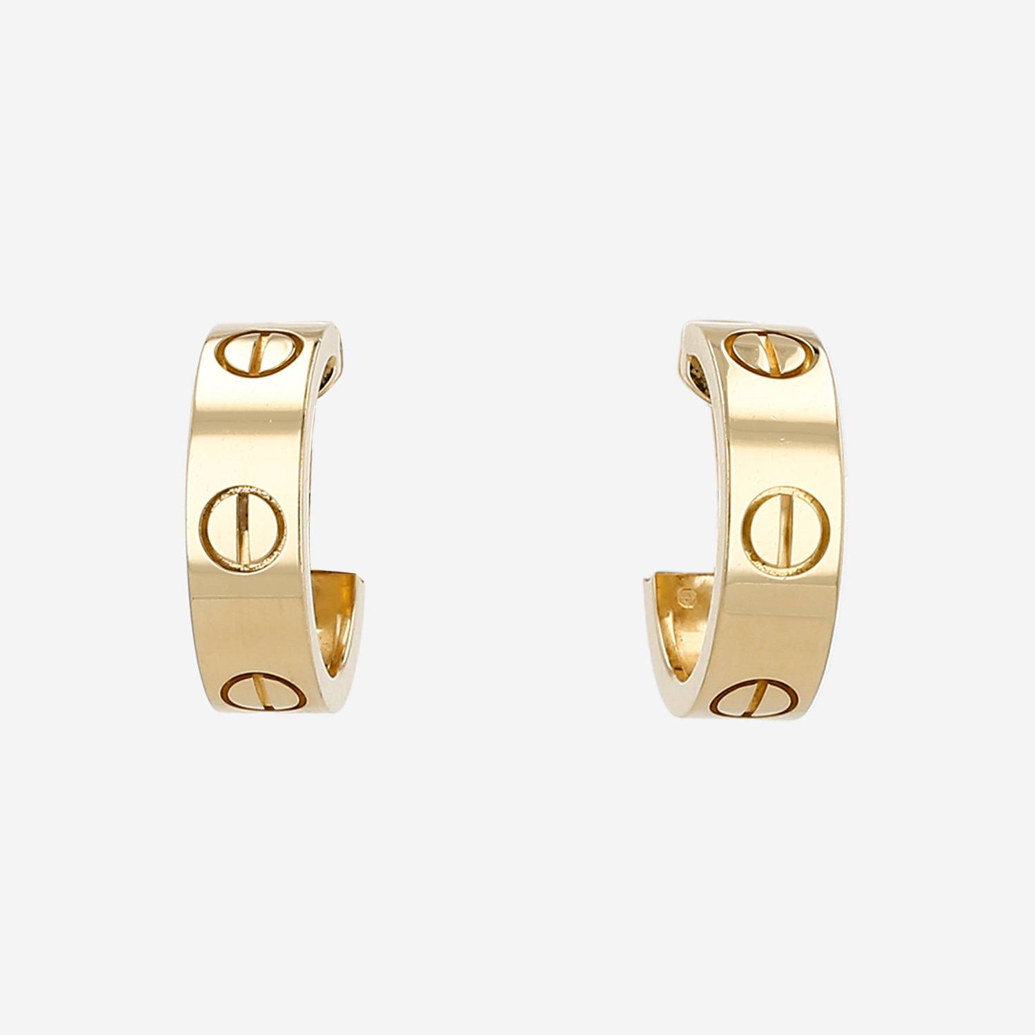 Orecchini a cerchio Cartier Love modello medio in oro giallo, composti da un elegante fascia liscia in oro giallo, ornati di motivi a vite incisi.