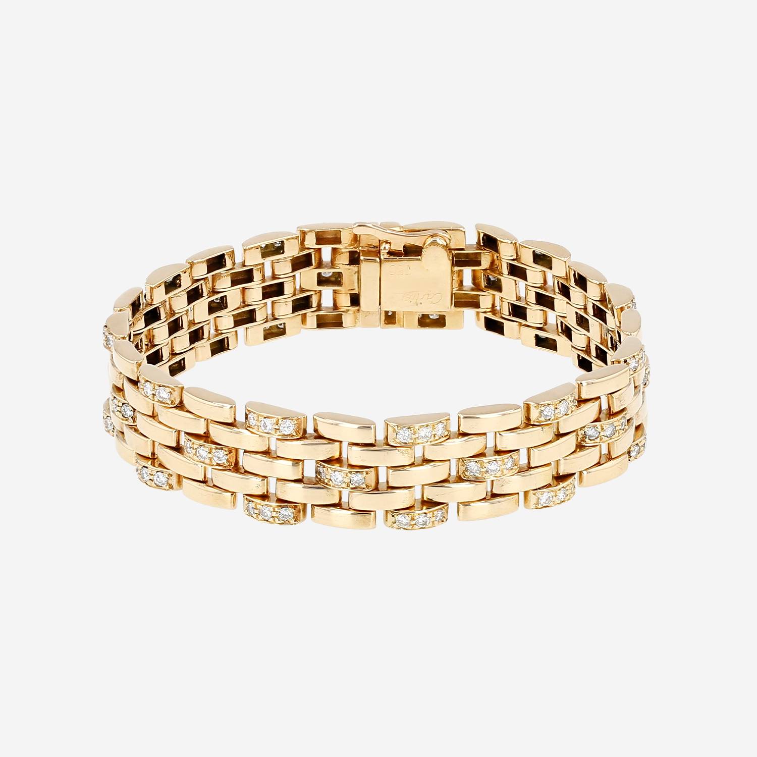 Bracciale mobile Cartier Maillon Panthère modello grande in oro giallo e diamanti, composto da una successione di bellissimi maglie geometriche mobili in oro giallo parzialmente incastonate di diamanti con taglio a brillante di circa 2 carati in totale.