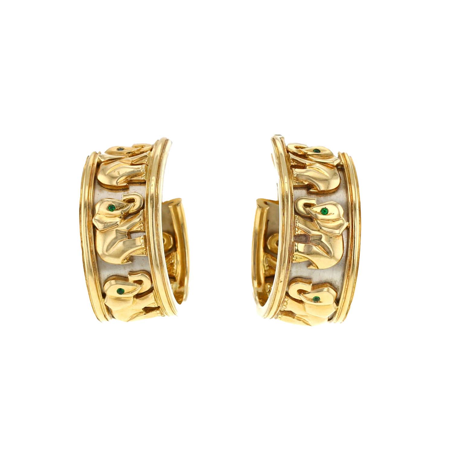 Orecchini Cartier in oro giallo, in oro bianco, e smeraldo, composti di larghe fasce in oro giallo, in oro bianco, ornati da elefanti in oro giallo delicatamente incastonati da smeraldo.