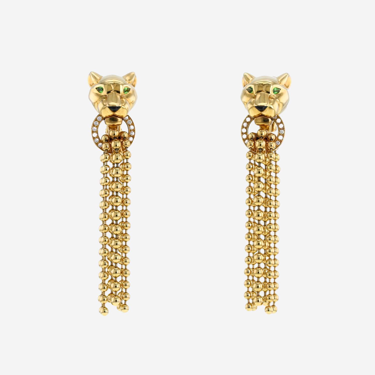 Orecchini Cartier Panthère in oro giallo, in diamanti, e Tsavorite, dotati di di belle pantere in oro giallo incastonate di Tsavorite con taglio a pera 0.04 carati di circa e da un cabochon in onice, che sostengono raffinate montature finemente incastonate di diamanti con taglio a brillante 0,10 carat arricchite di nappine perlati.