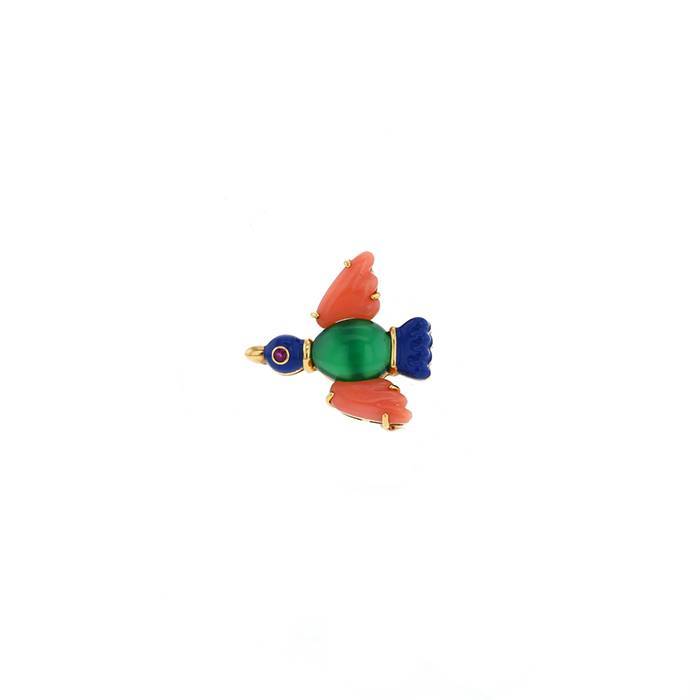 Spilla Cartier in oro giallo, in corallo, e crisoprasio, dotata di un uccello in oro giallo, in smalto blu delicatamente incastonati da un rubino, ornata di cabochon in corallo arricchiti da un cabochon in crisoprasio.