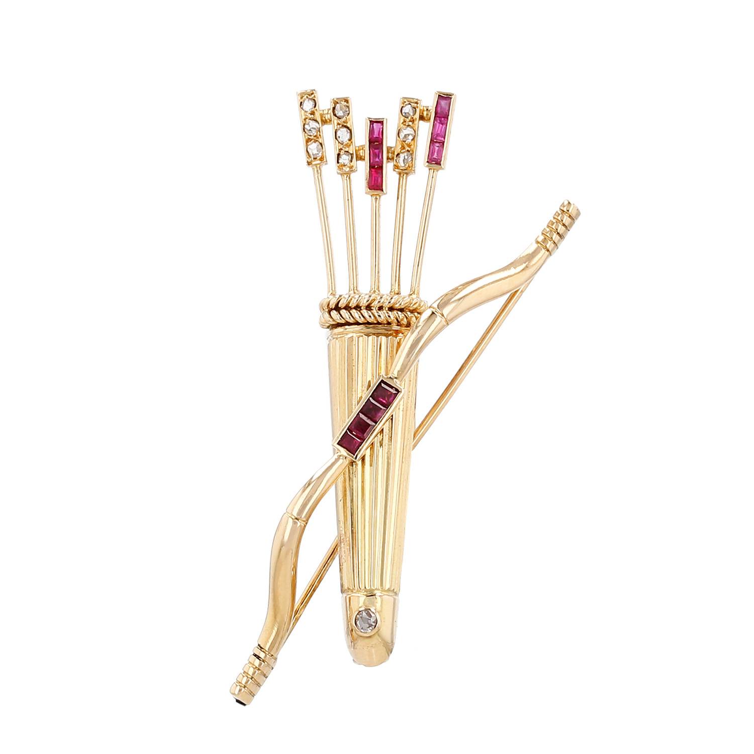Spilla Cartier in oro giallo, in rubini, e diamanti, composta da un elegante faretra godronato in oro giallo incastonato da un diamante, che sostengono 5 frecce incastonato di diamanti e di rubino quadrati, arricchita da un bella arco incastonato di rubini di taglio quadrato.