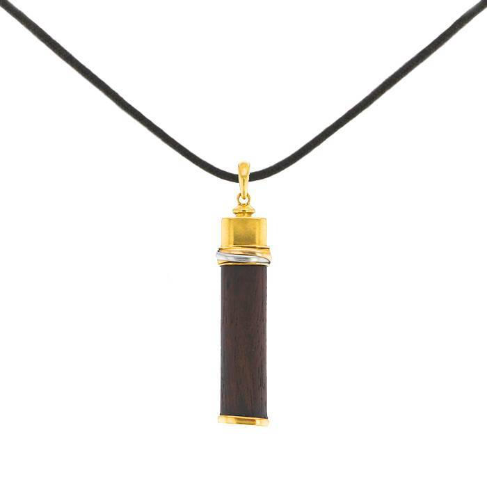 Magnifico ciondolo Cartier Touch Wood in 3 ori e legno amoretto, composto da un bellissimo motivo cilindrico in legno amoretto, ornato sulla parte superiore da un grazioso motivo intrecciato in 3 ori.