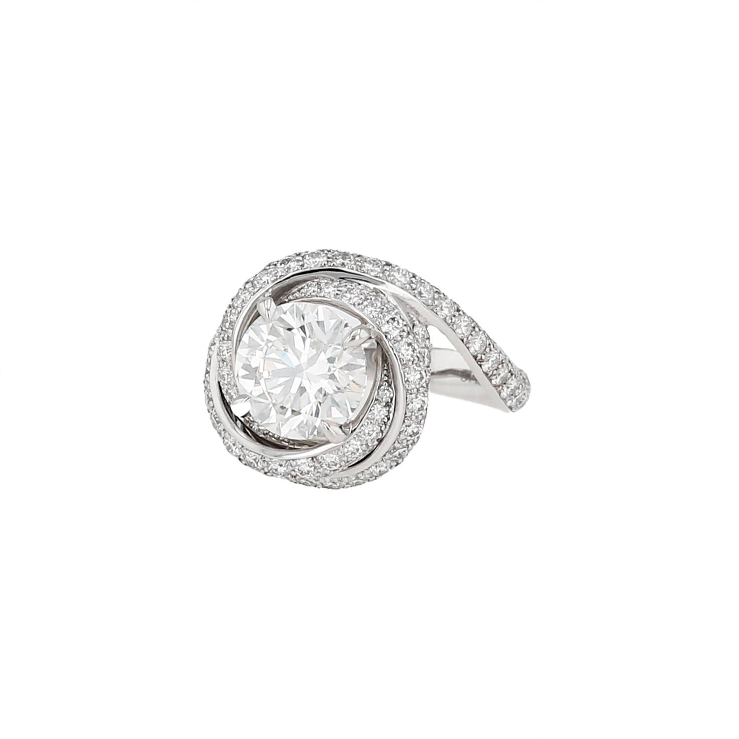 Anello Cartier Trinity Ruban in platino e diamanti, composto da un elegantissimo motivo bombato attorcigliato in platino finemente incastonato di diamanti con taglio a brillante 1.10 carati di circa, che sostengono al centro un straordinario diamante con taglio a brillante del peso totale 2.14 carati.